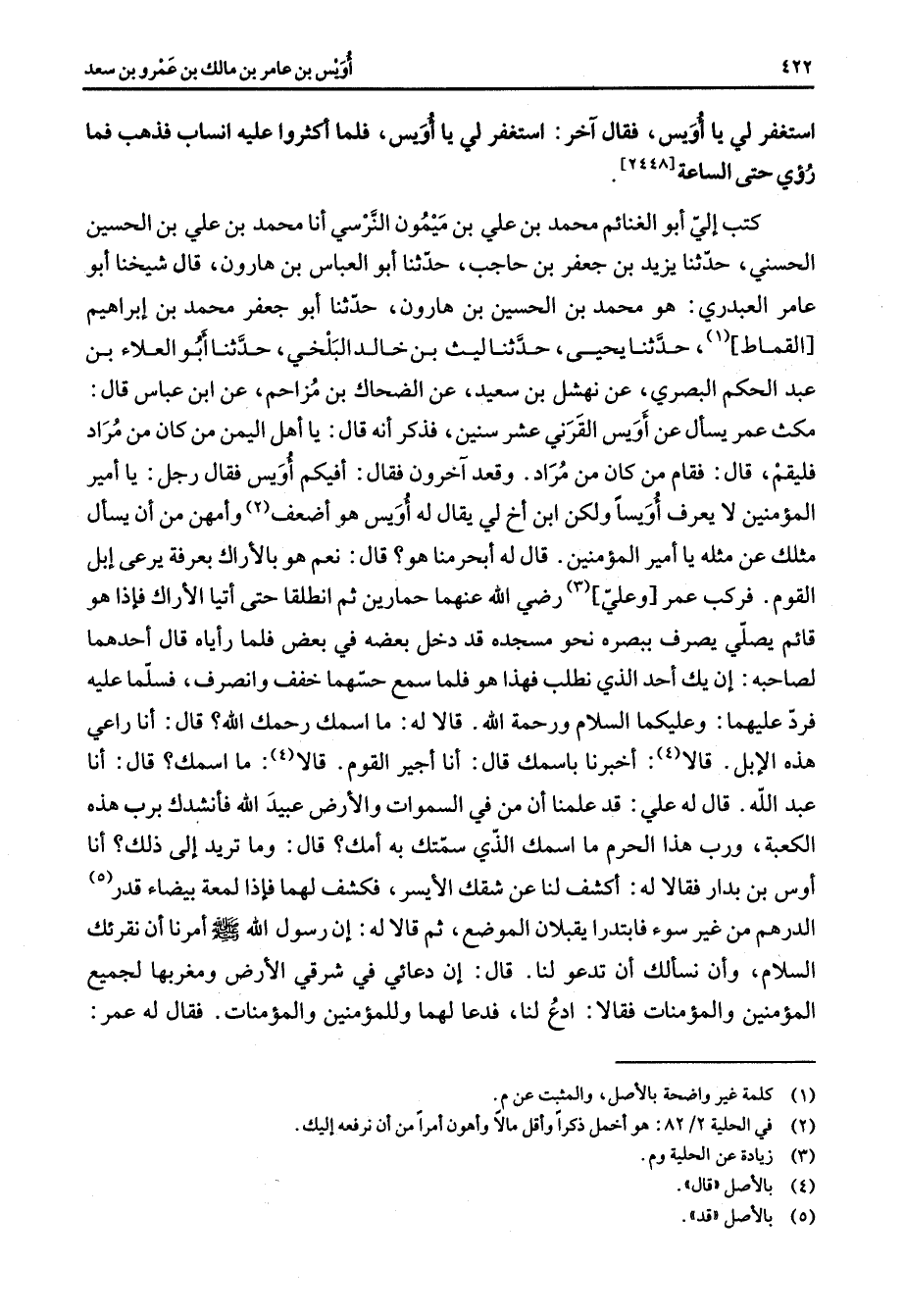 استغفر لي يا أويس فقال آخر استغفر لي يا أويس فلما أكثروا عليه انساب فذهب فما رؤي حتى الساعة كتب إلي أبو الغنائم محمد بن علي بن ميمون النرسي أنا محمد بن علي بن الحسين الحسني حدثنا يزيد بن جعفر بن حاجب حدثنا أبو العباس بن هارون قال شيخنا أبو عامر العبدري هو محمد بن الحسين بن هارون حدثنا أبو جعفر محمد بن إبراهيم القماط (1) حدثنا يحي حدثنا ليث بن خالد البلخي حدثنا أبو العلاء بن عبد الحكم البصري عن نهشل بن سعيد عن الضحاك بن مزاحم عن ابن عباس قال مكث عمر يسأل عن أويس القرني عشر سنين فذكر أنه قال يا أهل اليمن ما كان من مراد فليقم قال فقام من كان من مراد وقعد آخرون فقال أفيكم أويس فقال رجل يا أمير المؤمنين لا يعرف أويسا ولكن ابن أخ لي يقال له أويس هو أضعف (2) وأمهن من أن يسأل مثلك عن مثله يا أمير المؤمنين قال أبحر منا هو قال نعم هو بالأراك بعرفة يرعى إبل القوم فركب عمر وعلي (3) Bهما حمارين ثم انطلقا حتى أتيا الأراك فإذا هو قائم يصلي يصرف ببصره نحو مسجده قد دخل بعضه في بعض فلما رأياه قال أحدهما لصاحبه إن يك أحد الذي نطلب فهذا هو فلما سمع حسهما خفف وانصرف فسلما عليه فرد عليهما وعليكما السلام ورحمة الله قالا له ما اسمك رحمك الله قال أنا راعي هذه الإبل قالا (4) أخبرنا باسمك قال أنا أجير القوم قالا (4) ما اسمك قال أنا عبد الله قال له علي قد علمنا أن من في السموات والأرض عبيد الله فأنشدك برب هذه الكعبة ورب هذا الحرم ما اسمك الذي سمتك به أمك قال وما تريد إلى ذلك أنا أوس بن بدار فقالا له أكشف لنا عن شقك الأيسر فكشف لهما فإذا لمعه بيضاء قدر (5) الدرهم من غير سوء فابتدرا يقبلان الموضع ثم قالا له إن رسول الله (صلى الله عليه وسلم) أمرنا أن نقرئك السلام وأن نسألك أن تدعو لنا قال إن دعائي في شرقي الأرض ومغربها لجميع المؤمنين والمؤمنات فقالا ادع لنا فدعا لهما وللمؤمنين والمؤمنات فقال له عمر