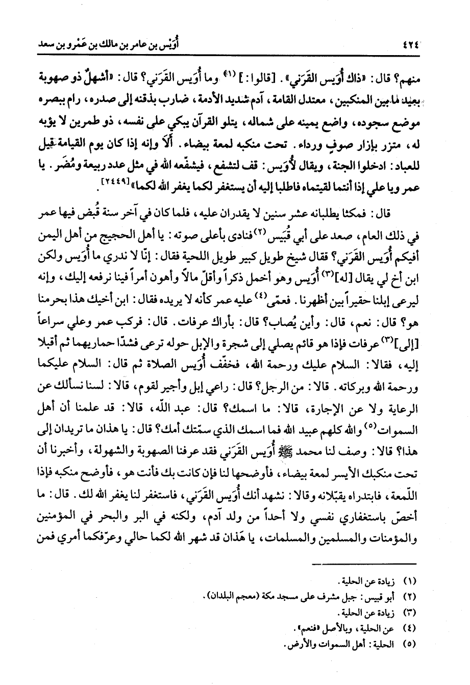 منهم قال ذاك أويس القرني قالوا (1) وما أويس القرني قال أشهل ذو صهوبة بعيد ما بين المنكبين معتدل القامة آدم شديد الأدمة ضارب بذقنه إلى صدره رام ببصره موضع سجوده واضع يمينه على شماله يتلوا القرآن يبكي على نفسه ذو طمرين لا يؤبه له متزر بإزار صوف ورداء تحت منكبه لمعه بيضاء ألا وإنه إذا كان يوم القيامة قيل للعباد ادخلوا الجنة ويقال لأويس قف لتشفع فيشفعه الله في مثل عدد ربيعة ومضر يا عمر ويا علي إذا أنتما لقيتماه فاطلبا إليه أن يستغفر لكما يغفر الله لكما قال فمكثا يطلبانه عشر سنين لا يقدران عليه فلما كان في آخر سنة قبض فيها عمر في ذلك العام صعد على أبي قبيس (2) فنادى بأعلى صوته يا أهل الحجيج من أهل اليمن أفيكم أويس القرني فقال شيخ طويل كبير طويل اللحية فقال إنا لا ندري ما أويس ولكن ابن أخ لي يقال له (3) أويس وهو أخمل ذكرا وأقل مالا وأهون أمرا فينا نرفعه إليك وإنه ليرعى إبلنا حقيرا بين أظهرنا فعمى (4) عليه عمر كأنه لا يريده فقال ابن أخيك هذا بحرمنا هو قال نعم قال وأين يصاب قال بأراك عرفات قال فركب عمر وعلي سراعا إلى (3) عرفات فإذا هو قائم يصلي إلى شجرة والإبل حوله ترعى فشدا حماريهما ثم أقبلا إليه فقالا السلام عليك ورحمة الله فخفف أويس الصلاة ثم قال السلام عليكما ورحمة الله وبركاته قالا من الرجل قال راعي إبل وأجير لقوم قالا لسنا نسألك عن الرعاية ولا عن الإجارة قالا ما اسمك قال عبد الله قالا قد علمنا أن أهل السموات (5) والله كلهم عبيد الله فما اسمك الذي سمتك أمك قال يا هذان ما تريدان إلى هذا قالا وصف لنا محمد (صلى الله عليه وسلم) أويس القرني فقد عرفنا الصهوبة والشهولة وأخبرنا أن تحت منكبك الأيسر لمعة بيضاء فأوضحها لنا فإن كانت بك فأنت هو فأوضح منكبة فإذا اللمعة فابتدراه يقبلانه وقالا نشهد أنك أويس القرني فاستغفر لنا يغفر الله لك قال ما أخص باستغفاري نفسي ولا أحدا من ولد آدم ولكنه في البر والبحر في المؤمنين والمؤمنات والمسلمين والمسلمات يا هذان قد شهر الله لكما حالي وعرفكما أمري فمن