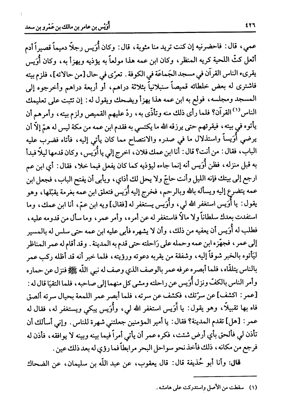 عمي فقال فاحضرنيه إن كنت تريد منا مثوبة قال وكان أويس رجلا دميما قصيرا أدم أثعل كث اللحية كريه المنظر وكان ابن عمه هذا مولعا به يؤذيه ويهزأ به وكان أويس يقرئ الناس القرآن في مسجد الجماعة في الكوفة تعرى في حال من حالاته فلزم بيته فاشترى له بعض خلطائه قميصا سنبلانيا بثلاثة دراهم أو أربعة دراهم وأخرجوه إلى المسجد ومجلسه فولع به ابن عمه هذا يهزأ ويضحك ويقول له إن تثبت على تعليمك الناس (1) القرآن فلما رأى ذلك منه وتأذى به رد عليهم القميص ولزم بيته وأمرهم أن يأتوه في بيته فيقرئهم حتى يرزقه الله ما يكتسي به فقدم ابن عمه من مكة ليس له هم إلا أن يرضي أويسا واستذلال ما في صدره والانتصاح مما كان يأتي إليه فأتاه فضرب عليه الباب فقال من أنت قال أنا ابن عمك فلان اخرج إلي يا أويس وكان قدمها ليلا فبدأ به قبل منزله فظن أويس أنه إنما جاءه ليؤذيه كما كان يفعل فيما خلا فقال أي ابن عم ارجع إلى بيتك فإنه الليل وأنت حاج ولا يحل لك أذاي ويأبى أن يفتح الباب فجعل ابن عمه يتضرع إليه ويسأله بالله وبالرحم فخرج إليه أويس فتعلق ابن عمه بغرمة يقبلها وهو يقول يا أويس استغفر الله لي وأويس يستغفر له فقال ويه ابن عم أنا ابن عمك وما استفدت بعدك سلطانا ولا مالا فاستغفر له عن أمره وأمر عمر وما سأل من قدومه عليه فطلب له أويس أن يعفيه من ذلك وأن لا يشهره فأبى عليه ابن عمه حتى سلس له بالمسير إلى عمر فجهزه ابن عمه وحمله على راحلته حتى قدم به المدينة وقد أقام له عمر المناظر ليأتوه بالخبر شوقا إليه وشفقة من يقربه دعوته ورؤيته فلما خبر أنه قد اظله ركب عمر بالناس يتلقاه فلما أبصره عرفه عمر بالوصف الذي وصف له نبي الله (صلى الله عليه وسلم) فنزل عن حماره وأمر الناس بالكف ونزل أويس عن راحلته ومشى كل منهما إلى صاحبه فلما التقيا قال له عمر اكشف عن سرتك فكشف عن سرته فلما أبصر عمر اللمعة بحيال سرته ألصق فاه بها تقبيلا وهو يقول يا أويس استغفر الله لي وأويس يبكي ويستغفر له فقال له عمر هل تقدم المدينة فقال يا أمير المؤمنين جعلتني شهرة للناس وإني أسألك أن تأذن لي فألحق بأي أرض شئت فكره عمر أن يأتي أن أمرا فيما بينه وبينه لا يوافقه فأذن له فرجع من مكانه ذلك فأخذ نحو سواحل البحر مرابطا فما رؤي له بعد ذلك عين قال وأنا أبو حذيفة قال قال يعقوب عن عبد الله بن سليمان عن الضحاك