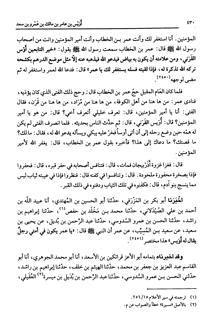 المؤمنين أنا أستغفر لك وأنت عمر بن الخطاب وأنت أمير المؤمنين وأنت من أصحاب رسول الله (صلى الله عليه وسلم) قال عمر بن الخطاب سمعت رسول الله (صلى الله عليه وسلم) يقول خير التابعين أوس القرني ومن علامته أن يكون به بياض فيدعو الله فيذهبه عنه إلا مثل موضع الدرهم بكشحه تركه الله تذكرة له فإذا لقيته فسله يستغفر لك يا عمر قال فدعا الله لعمر واستغفر له ثم مضى لوجهه فلما كان العام المقبل حج عمر بن الخطاب قال وحج ذلك الفتى الذي كان يؤذيه فنادى عمر من ها هنا من أهل الكوفة من ها هنا من مراد من ها هنا من قرن فقال الفتى أنا أمير المؤمنين قال تعرف خليلي أتعرف أخي قال من هو يا أمير المؤمنين قال أويس القرني قال ثم حدث الناس بحديثه فلما انصرف الفتى لم يكن له همه حين وضع رحله إلى أن أتى أوسا فخر عليه يبكي ويسأله يدعو الله له فقال مالك ما قصتك ما دعاك إلى هذا فأخبره بقول عمر بن الخطاب قال يغفر الله لأمير المؤمنين قال فغزا غزوة أذربيجان فمات قال فتنافس أصحابه في حفر قبره قال فحفروا فإذا بصخرة محفورة ملحودة قال وتنافسوا في كفته قال فنظروا فإذا في عيبتة ثياب ليس مما ينسج بنو آدم قال فكفنوه في تلك الثياب ودفنوه في ذلك القبر أخبرنا أبو بكر بن المزرفي حدثنا أبو الحسين بن المهتدي أنا عبيد الله بن احمد بن علي الصيدلاني حدثنا محمد بن مخلد بن حفص (1) حدثنا إبراهيم بن راشد حدثنا الحسن بن عمرو السدوسي حدثنا عبد الرحمن بن بديل عن يحيى بن سعيد عن سعيد بن المسيب عن عمر أن النبي (صلى الله عليه وسلم) قال يا عمر يكون في أمتي رجل يقال له أويس هذا مختصر وقد أخبرناه بتمامه أبو الأعز قراتكين بن الأسعد أنا أبو محمد الجوهري أنا أبو القاسم عبد العزيز بن جعفر بن محمد حدثنا الهيثم بن خلف حدثنا إبراهيم بن راشد حدثني الحسن بن عمرو السدوسي حدثنا عبد الرحمن بن بديل بن ميسرة (2) العقيلي
