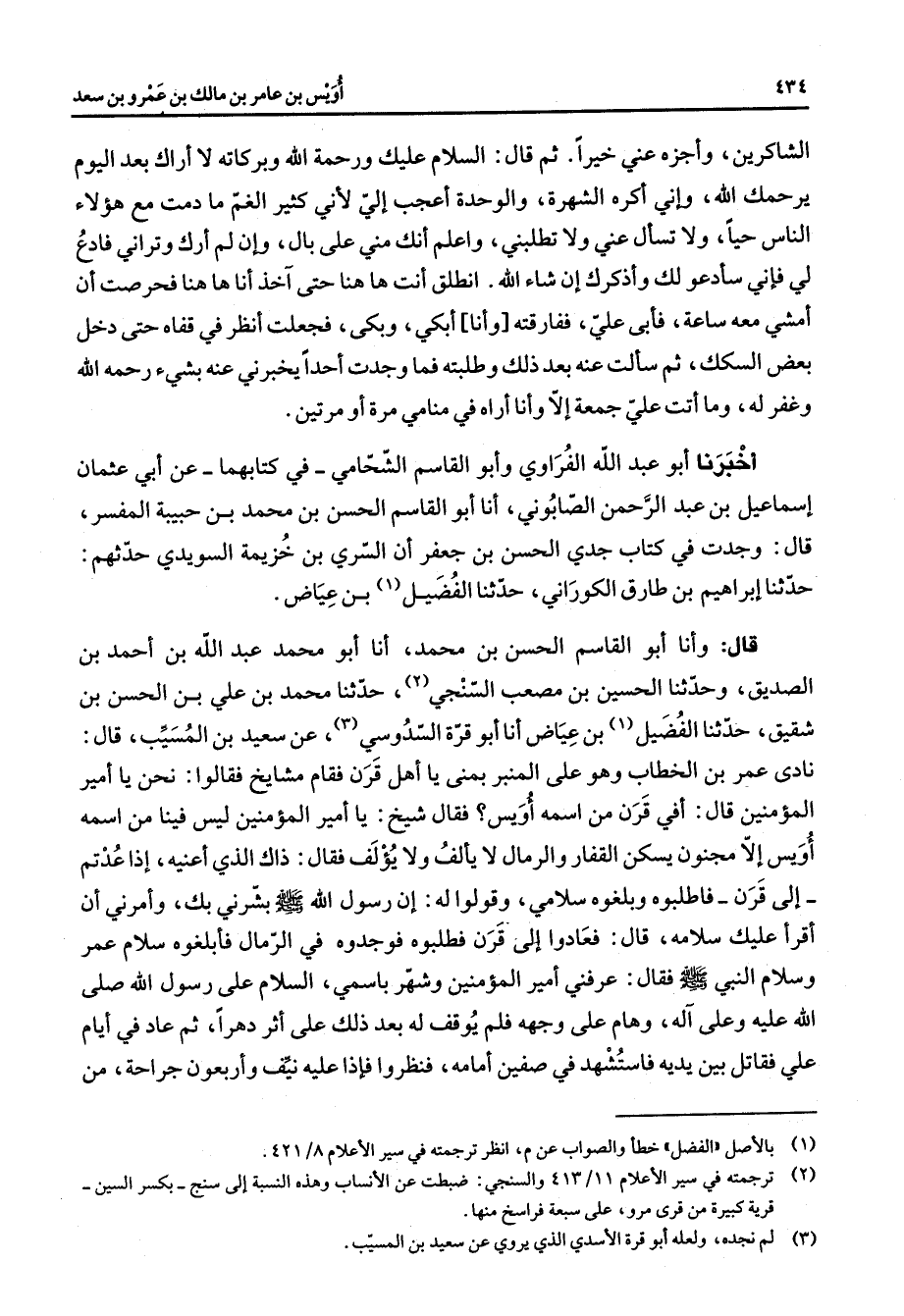 نعمتك من الشاكرين واجزه عني خيرا ثم قال السلام عليك ورحمة الله وبركاته لا أراك بعد اليوم يرحمك الله وإني أكره الشهرة والوحدة أعجب إلي لأني كثير الغم ما دمت مع هؤلاء الناس حيا ولا تسأل عني ولا تطلبني واعلم أنك مني على بال وإن لم أرك وتراني فادع لي فإني سأدعو لك واذكرك إن شاء الله انطلق أنت ها هنا حتى آخذ أنا ها هنا فحرصت أن أمشي معه ساعة فأبى علي ففارقته وأنا أبكي وبكى فجعلت أنظر في قفاه حتى دخل بعض السكك ثم سألت عنه بعد ذلك وطلبته فما وجدت أحدا يخبرني عنه بشئ رحمه الله وغفر له وما أتت علي جمعة إلا وأنا أراه في منامي مرة أو مرتين أخبرنا أبو عبد الله الفراوي وأبو القاسم الشحامي في كتابهما عن أبي عثمان إسماعيل بن عبد الرحمن الصابوني أنا أبو القاسم الحسن بن محمد بن حبيبة المفسر قال وجدت في كتاب جدي الحسن بن جعفر أن السري بن خزيمة السويدي حدثهم حدثنا إبراهيم بن طارق الكوراني حدثنا الفضيل (1) بن عياض قال وأنا أبو القاسم الحسن بن محمد أنا أبو محمد عبد الله بن أحمد بن الصديق وحدثنا الحسين بن مصعب السنجي (2) حدثنا محمد بن علي بن الحسن بن شقيق حدثنا الفضيل بن عياض أنا أبو قرة السدوسي (3) عن سعيد بن المسيب قال نادى عمر بن الخطاب وهو على المنبر بمنى يا أهل قرن فقام مشايخ فقالوا نحن يا أمير المؤمنين قال أفي قرن من اسمه أويس فقال شيخ يا أمير المؤمنين ليس فينا من اسمه أويس إلا مجنون يسكن القفار والرمال لا يألف ولا يؤلف فقال ذاك الذي أعنيه إذا عدتم إلى قرن فاطلبوه وبلغوه سلامي وقولوا له إن رسول الله (صلى الله عليه وسلم) بشرني بك وأمرني أن أقرأ عليك سلامه قال فعادوا إلى قرن فطلبوه فوجدوه في الرمال فأبلغوه سلام عمر وسلام النبي (صلى الله عليه وسلم) فقال عرفني أمير المؤمنين وشهر باسمي السلام على رسول الله صلى الله عليه وعلى آله وهام على وجهه فلم يوقف له بعد ذلك على أثر دهرا ثم عاد في أيام علي فقاتل بين يديه فاستشهد في صفين أمامه فنظروا فإذا عليه نيف وأربعون جراحة من