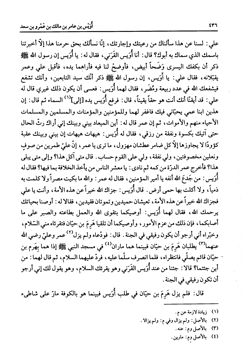 علي لسنا عن هذا سألناك من رعيتك وإجارتك إنا نسألك بحق حرمنا هذا إلا أخبرتنا باسمك الذي سماك به أبوك قال أنا أويس القرني فقال له يا أويس إن رسول الله (صلى الله عليه وسلم) ذكر أن بكفك اليسرى وضحا أبيض فأوضح لنا فيه فأراهما يده فأقبل علي وعمر يقبلاته فقال علي يا أويس إن رسول الله (صلى الله عليه وسلم) ذكر أنك سيد التابعين وأنك تشفع فيشفعك الله في عدد ربيعة ومضر فقال لهما أويس فعسى أن يكون ذلك غيري قال له علي قد أيقنا أنك أنت هو حقا يقينا قال فرفع أويس يده إلى (1) السماء ثم قال إن هذين ابنا عمي يحباني فيك فاغفر لهما وللمؤمنين والمؤمنات والمسلمين والمسلمات الأحياء منهم والأموات ثم إن عمر قال له أين الميعاد بيني وبينك إني أراك رث الحال حتى آتيك بكسوة ونفقة من رزقي فقال له أويس هيهات هيهات إن بيني وبينك عقبة كؤودا لا يجاوزها إلا كل ضامر عطشان مهزول ما ترى يا عمر إن علي طمرين من صوف ونعلين مخصوفتين ولي نفقة ولي على القوم حساب قال متى آكل هذا وإلى متى يبلى هذا فأخرج عمر الدرة من كمه ثم نادى يا معشر الناس من يأخذ الخلافة بما فيها فقال له أويس من جدع الله أنفه يا أمير المؤمنين فقال له عمر والله ما بكيت مصرا ولا كلمت به ذميا ولا أكلت بها حمى أرض قال أويس جزاك الله خيرا عن هذه الأمة وأنت يا علي فجزاك الله خيرا عن هذه الأمة تعيشان حميدين وتموتان فقيدين فقالا له أوصنا بحياتك يرحمك الله فقال لهما أويس أوصيكما بتقوى الله والعمل بطاعته والصبر على ما أصابكما فإن ذلك من عزم الأمور وأوصيكما أن تلقيا هرم بن حيان فتقرئاه مني السلام وخبراه أني أرجو أن يكون رفيقي في الجنة قال فودعاه ولم يزل (2) عمر وعلي Bهما (3) يطلبان هرم بن حيان فبينما هما ماران (4) في مسجد النبي (صلى الله عليه وسلم) إذا هما بهرم بن حيان قائم يصلي فانتظراه فلما انصرف سلما عليه فرد عليهما السلام ثم قال لهما من أين جئتما قالا جئنا من عند أويس القرني وهو يقرئك السلام وهو يقول لك إني أرجو أن تكون رفيقي في الجنة قال فلم يزل هرم بن حيان في طلب أويس فبينما هو بالكوفة مار على شاطئ