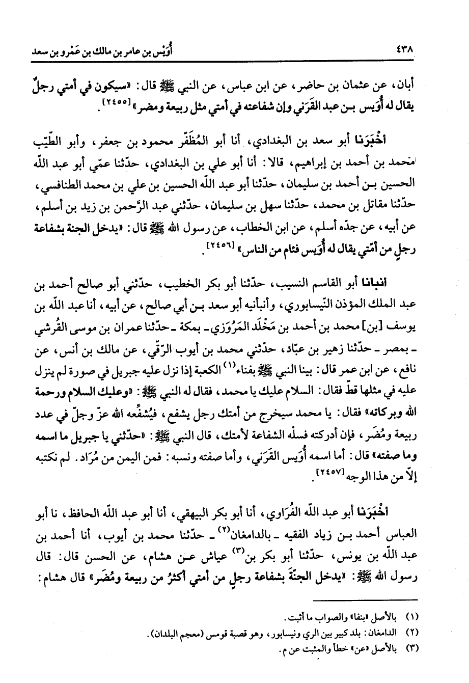 أبان عن عثمان بن حاضر عن ابن عباس عن النبي (صلى الله عليه وسلم) قال سيكون في أمتي رجل يقال له أويس بن عبد القرني وإن شفاعته في أمتي مثل ربيعة ومضر أخبرنا أبو سعد بن البغدادي أنا أبو المظفر محمود بن جعفر وأبو الطيب محمد بن أحمد بن إبراهيم قالا أنا أبو علي بن البغدادي حدثنا عمي أبو عبد الله الحسين بن أحمد بن سليمان حدثنا أبو عبد الله الحسين بن علي بن محمد الطنافسي حدثنا مقاتل بن محمد حدثنا سهل بن سليمان حدثني عبد الرحمن بن زيد بن أسلم عن أبيه عن جده أسلم عن ابن الخطاب عن رسول الله (صلى الله عليه وسلم) قال يدخل الجنة بشفاعة رجل من أمتي يقال له أويس فئام من الناس أنبأنا أبو القاسم النسيب حدثنا أبو بكر الخطيب حدثني أبو صالح أحمد بن عبد الملك المؤذن النيسابوري وأنبأنيه أبو سعد بن أبي صالح عن أبيه أنا عبد الله بن يوسف بن محمد بن أحمد بن مخلد المروزي بمكة حدثنا عمران بن موسى القرشي بمصر حدثنا زهير بن عباد حدثني محمد بن أيوب الرقي عن مالك بن أنس عن نافع عن ابن عمر قال بينا النبي (صلى الله عليه وسلم) بفناء (1) الكعبة إذا نزل عليه جبريل في صورة لم ينزل عليه في مثلها قط فقال السلام عليك يا محمد فقال له النبي (صلى الله عليه وسلم) وعليك السلام ورحمة الله وبركاته فقال يا محمد سيخرج من أمتك رجل يشفع فيشفعه الله عز وجل في عدد ربيعة ومضر فإن أدركته فسله الشفاعة لأمتك قال النبي (صلى الله عليه وسلم) حدثني يا جبريل ما اسمه وما صفته قال أما اسمه أويس القرني وأما صفته ونسبه فمن اليمن من مراد لم نكتبه إلا من هذا الوجه أخبرنا أبو عبد الله الفراوي أنا أبو بكر البيهقي أنا أبو عبد الله الحافظ نا أبو العباس أحمد بن زياد الفقيه بالدامغان (2) حدثنا محمد بن أيوب أنا أحمد بن عبد الله بن يونس حدثنا أبو بكر بن (3) عياش عن هشام عن الحسن قال قال رسول الله (صلى الله عليه وسلم) يدخل الجنة بشفاعة رجل من أمتي أكثر من ربيعة ومضر قال هشام