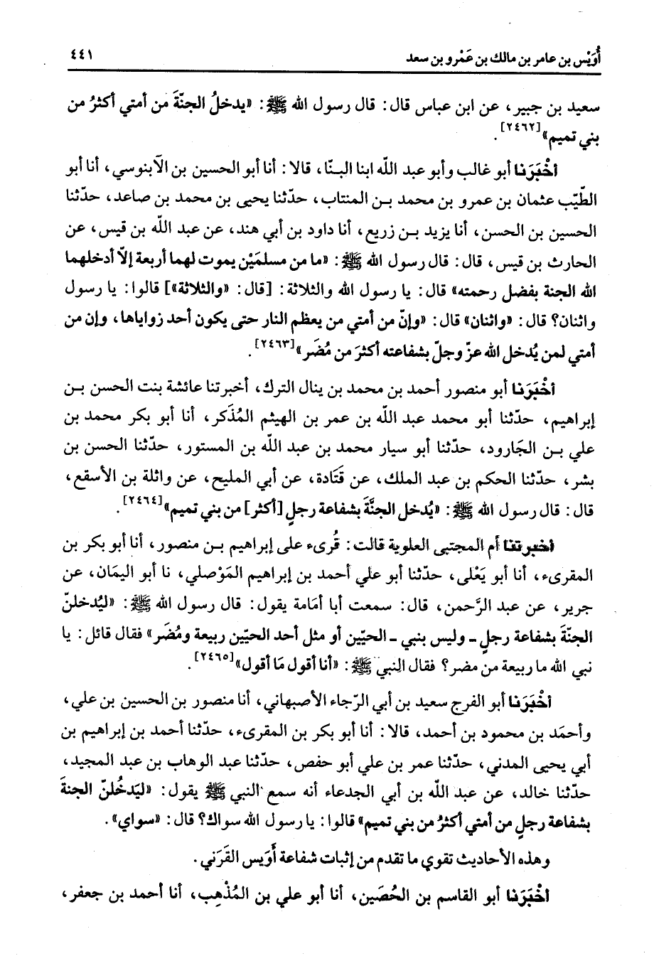 سعيد بن جبير عن ابن عباس قال قال رسول الله (صلى الله عليه وسلم) يدخل الجنة من أمتي أكثر من بني تميم أخبرنا أبو غالب وأبو عبد الله ابنا البنا قالا أنا أبو الحسين بن الآبنوسي أنا أبو الطيب عثمان بن عمرو بن محمد بن المنتاب حدثنا يحيى بن محمد بن صاعد حدثنا الحسين بن الحسن أنا يزيد بن زريع أنا داود بن أبي هند عن عبد الله بن قيس عن الحارث بن قيس قال قال رسول الله (صلى الله عليه وسلم) ما من مسلمين يموت لهما أربعة إلا أدخلهما الله الجنة بفضل رحمته قال يا رسول الله والثلاثة قال والثلاثة قالوا يا رسول الله واثنان قال واثنان قال وإن من أمتي من يعظم النار حتى يكون أحد زواياها وإن من أمتي لمن يدخل الله عز وجل بشفاعته أكثر من مضر أخبرنا أبو منصور أحمد بن محمد بن ينال الترك أخبرتنا عائشة بنت الحسن بن إبراهيم حدثنا أبو محمد عبد الله بن عمر بن الهيثم المذكر أنا أبو بكر محمد بن علي بن الجارود حدثنا أبو سيار محمد بن عبد الله بن المستور حدثنا الحسن بن بشر حدثنا الحكم بن عبد الملك عن قتادة عن أبي المليح عن وائلة بن الأسقع قال قال رسول الله (صلى الله عليه وسلم) يدخل الجنة بشفاعة رجل أكثر من بني تميم أخبرتنا أم المجتبى العلوية قالت قرئ على إبراهيم بن منصور أنا أبو بكر بن المقرئ أنا أبو يعلى حدثنا أبو علي أحمد بن إبراهيم الموصلي نا أبو اليمان عن جرير عن عبد الرحمن قال سمعت أبا أمامة يقول قال رسول الله (صلى الله عليه وسلم) ليدخلن الجنة بشفاعة رجل وليس بنبي الحيين أو مثل أحد الحيين ربيعة ومضر قال قائل يا نبي الله ما ربيعة من مضر فقال النبي (صلى الله عليه وسلم) أنا أقول ما أقول أخبرنا أبو الفرج سعيد بن أبي الرجاء الأصبهاني أنا منصور بن الحسين بن علي وأحمد بن محمود بن أحمد قالا أنا أبو بكر بن المقرئ حدثنا أحمد بن إبراهيم بن أبي يحيى المدني حدثنا عمر بن علي أبو حفص حدثنا عبد الوهاب بن عبد المجيد حدثنا خالد عن عبد الله بن أبي الجدعاء أنه سمع النبي (صلى الله عليه وسلم) يقول ليدخلن الجنة بشفاعة رجل من أمتي أكثر من بني تميم قالوا يا رسول الله سواك قال سواي وهذه الأحاديث تقوي ما تقدم من إثبات شفاعة أويس القرني أخبرنا أبو القاسم بن الحصين أنا أبو علي بن المذهب أنا أحمد بن جعفر