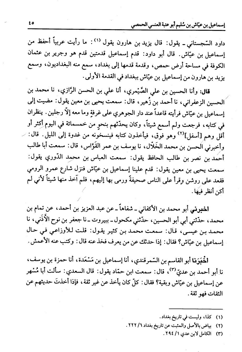 داود السجستاني يقول قال يزيد بن هارون يقول (1) ما رأيت عربيا أحفظ من إسماعيل بن عياش قال أبو داود قدم إسماعيل قدمتين قدم هو وجرير بن عثمان الكوفة في مساحة أرض حمص وقدمة قدمها إلى بغداد سمع منه البغداديون وسمع يزيد بن هارون من إسماعيل بن عياش ببغداد في القدمة الأولى قال وأنا الحسين بن علي الصيمري أنا علي بن الحسن الرازي نا محمد بن الحسين الزعفراني نا أحمد بن زهير قال سمعت يحيى بن معين يقول مضيت إلى إسماعيل بن عياش فرأيته قاعدا عند دار الجوهري على غرفة وما معه إلا رجلين ينظران في كتابه فرجعت ولم أسمع شيئا وكان يحدثهم بنحو من خمسمائة في اليوم اكثر أو أقل وهم أسفل (2) وهو فوق فيأخذون كتابه فينسخونه من غدوة إلى الليل قال وأخبرني الحسن بن محمد الخلال نا يوسف بن عمر القواس قال سمعت أبا طالب أحمد بن نصر بن طالب الحافظ يقول سمعت العباس بن محمد الدوري يقول سمعت يحيى بن معين يقول قدم علينا إسماعيل بن عياش فنزل شارع عمرو الرومي فقعد على روشن وقرأ على الناس صحيفة ورمى بها إليهم فلم آخذ منها شيئا لأني لم أكن أنظر فيها أخبرنا أبو محمد الأكفاني شفاها عن عبد العزيز بن أحمد عن تمام بن محمد حدثني أبي أبو الحسين حدثني مكحول ببيروت نا جعفر بن نوح الأذني نا محمد بن عيسى قال سمعت محمد بن كثير يقول قلت للأوزاعي في حال إسماعيل بن عياش فقال إذا حدثك عن من يعرف فخذ عنه قال وكتب عنه الأعمش أخبرنا أبو القاسم السمرقندي أنا إسماعيل بن مسعدة أنا حمزة بن يوسف نا أبو أحمد بن عدي (3) قال سمعت ابن حماد يقول قال السعدي سألت أبا مسهر عن إسماعيل بن عياش وبقية فقال كل كان يأخذ عن غير ثقة فإذا أخذت حديثهم عن الثقات فهو ثقة