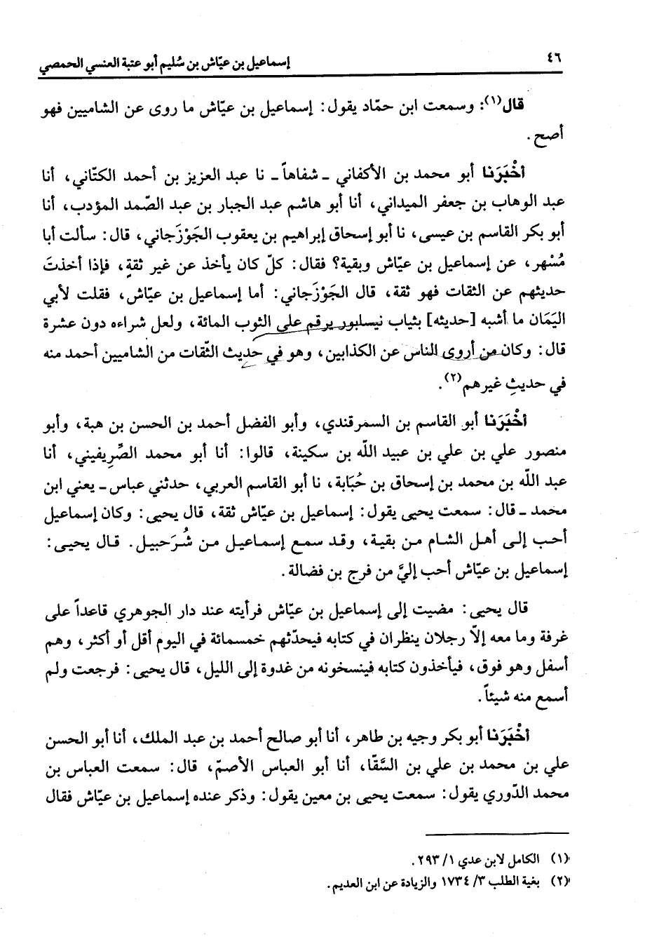 قال (1) وسمعت ابن حماد يقول إسماعيل بن عياش ما روى عن الشاميين فهو أصح أخبرنا أبو محمد بن الأكفاني شفاها نا عبد العزيز بن احمد الكتاني أنا عبد الوهاب بن جعفر الميداني أنا أبو هاشم عبد الجبار بن عبد الصمد المؤدب أنا أبو بكر القاسم بن عيسى نا أبو إسحاق إبراهيم بن يعقوب الجوزجاني قال سألت أبا مسهر عن إسماعيل بن عياش وبقية فقال كل كان يأخذ عن غير ثقة فإذا أخذت حديثهم عن الثقات فهو ثقة قال الجوزجاني أما إسماعيل بن عياش فقلت لأبي اليمان ما أشبه حديثه بثياب نيسابور يرقم على الثوب المائة ولعل شراءه دون عشرة قال وكان من أروى الناس عن الكذابين وهو في حديث الثقات من الشاميين أحمد منه في حديث غيرهم (2) أخبرنا أبو القاسم بن السمرقندي وأبو الفضل احمد بن الحسن بن هبة وأبو منصور علي بن علي بن عبيد الله بن سكينة قالوا أنا أبو محمد الصريفيني أنا عبد الله بن محمد بن إسحاق بن حبابة نا أبو القاسم العربي حدثني عباس يعني ابن محمد قال سمعت يحي ى يقول إسماعيل بن عياش ثقة قال يحيى وكان إسماعيل أحب إلى أهل الشام من بقية وقد سمع إسماعيل من شرحبيل قال يحيى إسماعيل بن عياش أحب إلي من فرج بن فضالة قال يحيى مضيت إلى إسماعيل بن عياش فرأيته عند دار الجوهري قاعدا على غرفة وما معه إلا رجلان ينظران في كتابه فينسخونه من غدوة إلى الليل قال يحيى فرجعت ولم أسمع منه شيئا أخبرنا أبو بكر وجيه بن طاهر أنا أبو صالح أحمد بن عبد الملك أنا أبو الحسن علي بن محمد بن علي بن السقا أنا أبو العباس الأصم قال سمعت العباس بن محمد الدوري يقول سمعت يحيى بن معين يقول وذكر عنده إسماعيل بن عياش فقال