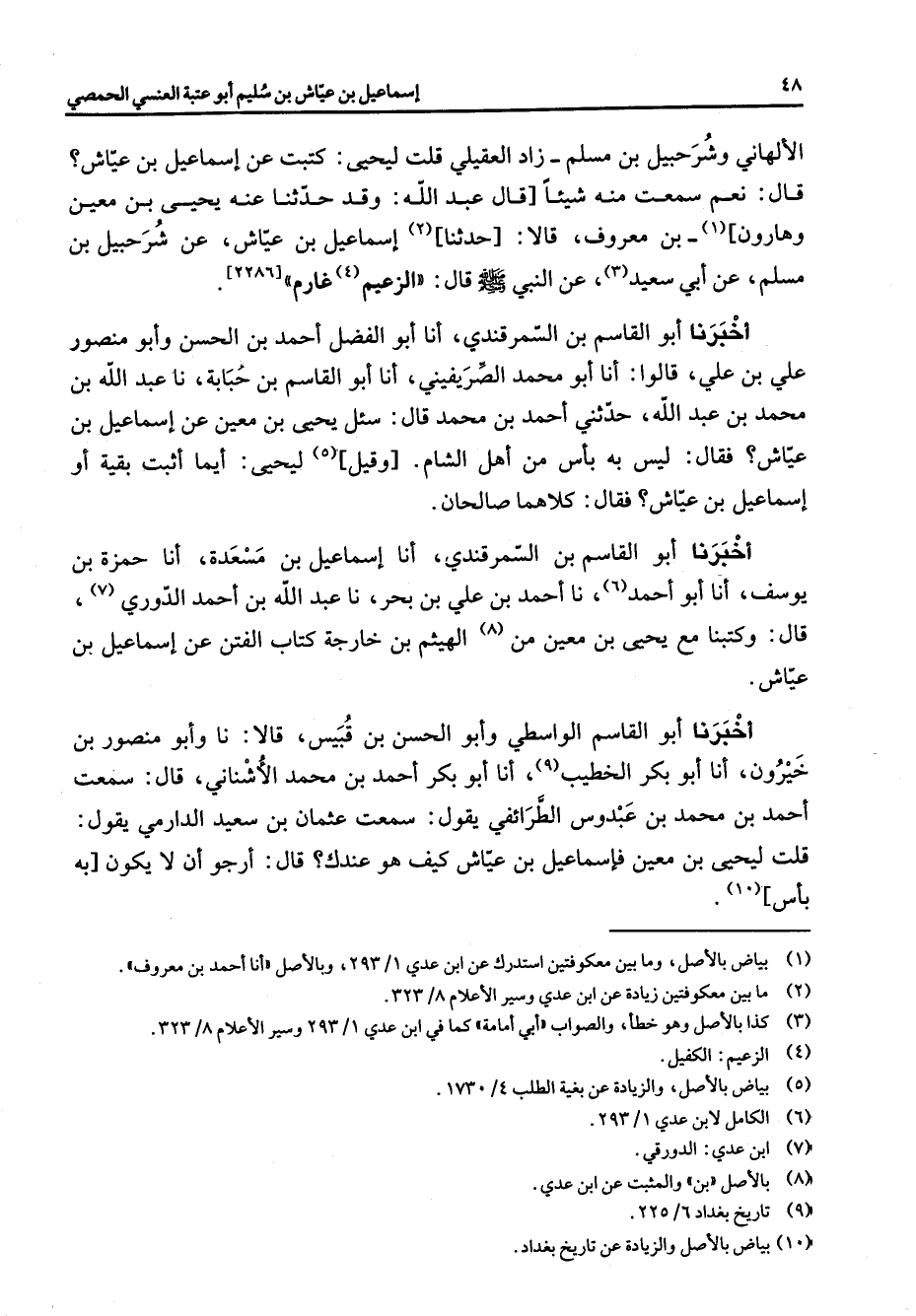 الألهاني وشرحبيل بن مسلم زاد العقيلي قلت ليحيى كتبت عن إسماعيل بن عياش قال نعم سمعت منه شيئا قال عبد الله وقد حدثنا عنه يحيى بن معين وهارون (1) بن معروف قالا حدثنا (2) إسماعيل بن عياش عن شرحبيل بن مسلم عن أبي سعيد (3) عن النبي (صلى الله عليه وسلم) قال الزعيم غارم (4) أخبرنا أبو القاسم بن السمرقندي أنا أبو الفضل أحمد بن الحسن وأبو منصور علي بن علي قالوا أنا أبو محمد الصريفيني أنا أبو القاسم بن حبابة نا عبد الله بن محمد بن عبد الله حدثني أحمد بن محمد قال سئل يحيى بن معين عن إسماعيل بن عياش فقال ليس به بأس من أهل الشام وقيل (5) ليحيى أيما أثبت بقية أو إسماعيل بن عياش فقال كلاهما صالحان أخبرنا أبو القاسم بن السمرقندي أنا إسماعيل بن مسعدة أنا حمزة بن يوسف أنا أبو أحمد (6) نا أحمد بن علي بن بحر نا عبد الله بن أحمد الدوري (7) قال وكتبنا مع يحيى بن معين من (8) الهيثم بن خارجة كتاب الفتن عن إ سماعيل بن عياش أخبرنا أبو القاسم الواسط وأبو الحسن بن قبيس قالا نا وأبو منصور بن خيرون أنا أبو بكر الخطيب (9) أنا أبو بكر أحمد بن محمد الأشناني قال سمعت أحمد بن محمد بن عبدوس الطرائفي يقول سمعت عثمان بن سعيد الدارمي يقول قلت ليحيى بن معين فإسماعيل بن عياش كيف هو عندك قال أرجو أن لا يكون به بأس (10)