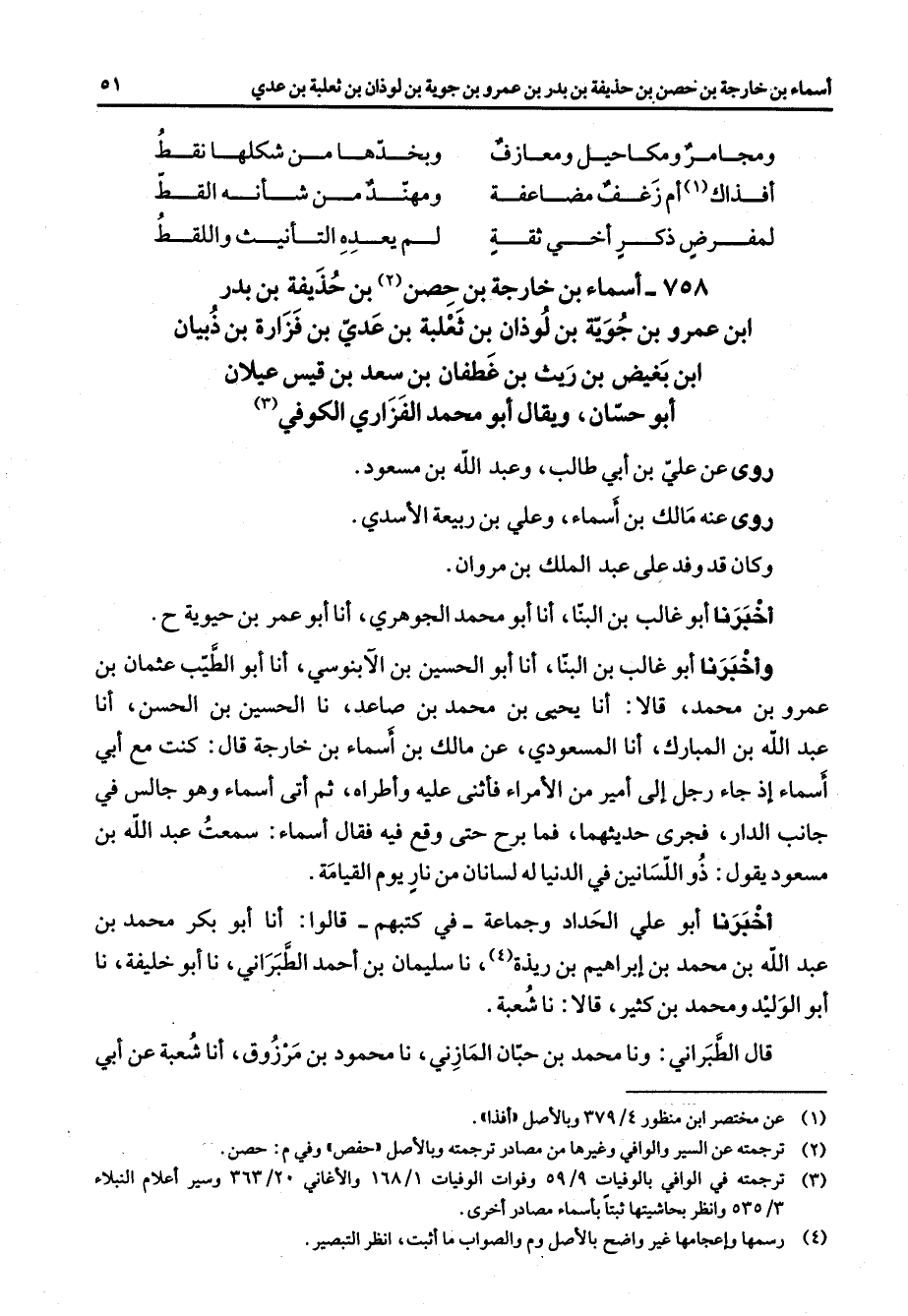 758 - أسماء بن خارجة بن حصن (2) بن حذيفة بن بدر ابن عمرو بن جوية بن لوذان بن ثعلبة بن عدي بن فزارة بن ذبيان ابن بغيض بن ريث بن غطفان بن سعد بن قيس عيلان أبو حسان ويقال أبو محمد الفزاري الكوفي (3) روى عن علي بن أبي طالب وعبد الله بن مسعود روى عنه مالك بن أسماء وعلي بن ربيعة الأسدي وكان قد وفد على عبد الملك بن مروان أخبرنا أبو غالب بن البنا أنا أبو محمد الجوهري أنا أبو عمر بن حيوية وأخبرنا أبو غالب بن البنا أنا أبو الحسين بن الآبنوسي أنا أبو الطيب عثمان بن عمرو بن محمد قالا أنا يحيى بن محمد بن صاعد نا الحسين بن الحسن أنا عبد الله بن المبارك أنا المسعودي عن مالك بن أسماء بن خارجة قال كنت مع أبي أسماء إذ جاء رجل إلى أمير من الأمراء فأثنى عليه وأطراه ثم أتى أسماء وهو جالس في جانب الدار فجرى حديثهما فما برح حتى وقع فيه فقال أسماء سمعت عبد الله بن مسعود يقول ذو اللسانين في الدنيا له لسانان من نار يوم القيامة اخبرنا أبو علي الحداد وجماعة في كتبهم قالوا أنا أبو بكر محمد بن عبد الله بن محمد بن إبراهيم بن ريذة (4) نا سليمان بن أحمد الطبراني نا أبو خليفة نا أبو الوليد ومحمد بن كثير قالا نا شعبة قال الطبراني ونا محمد بن حبان المازني نا محمود بن مرزوق أنا شعبة عن أبي