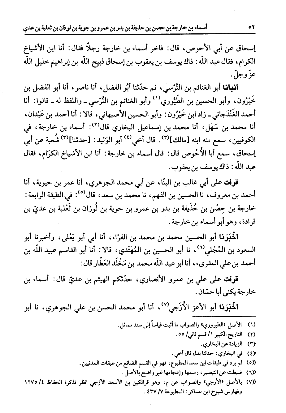 إسحاق عن أبي الأحوص قال فاخر أسماء بن خارجة رجلا فقال أنا ابن الأشياخ الكرام فقال عبد الله ذاك يوسف بن يعقوب بن إسحاق ذبيح الله بن إبراهيم خليل الله عز وجل أنبأنا أبو الغنائم بن النرسي ثم حدثنا أبو الفضل أنا ناصر أنا أبو الفضل بن خيرون وأبو الحسين بن الطيوري (1) وأبو الغنائم بن النرسي واللفظ له قالوا أنا أحمد الغندجاني زاد ابن خيرون وأبو الحسين الأصبهاني قالا أنا أحمد بن عبدان أنا محمد بن سهل أنا محمد بن إسماعيل البخاري قال (2) أسماء بن خارجة في الكوفيين سمع منه ابنه مالك (3) قال أخي (4) أبو الوليد حدثنا (3) شعبة عن أبي إسحاق سمع أبا الأحوص قال قال أسماء بن خارجة أنا ابن الأشياخ الكرام فقال عبد الله ذاك يوسف بن يعقوب قرأت على أبي غالب بن البنا عن أبي محمد الجوهري أنا عمر بن حيوية أنا أحمد بن معروف نا الحسين بن الفهم نا محمد بن سعد (5) قال في الطبقة الرابعة خارجة بن حصن بن حذيفة بن بدر بن عمرو بن حوية بن لوزان بن ثعلبة بن عدي بن قرادة وهو أبو أسماء بن خارجة أخبرنا أبو الحسين محمد بن محمد بن الفراء أنا أبي أبو يعلى وأخبرنا أبو السعود بن المجلي (6) نا أبو الحسين بن المهتدي قالا أنا أبو القاسم عبيد الله بن أحمد بن علي المقرئ أنا أبو عبد الله محمد بن مخلد العطار قال قرأت على علي بن عمرو الأنصاري حدثكم الهيثم بن عدي قال أسماء بن خارجة يكنى أبا حسان أخبرنا أبو الأعز الأزجي (7) أنا أبو محمد الحسن بن علي الجوهري نا أبو