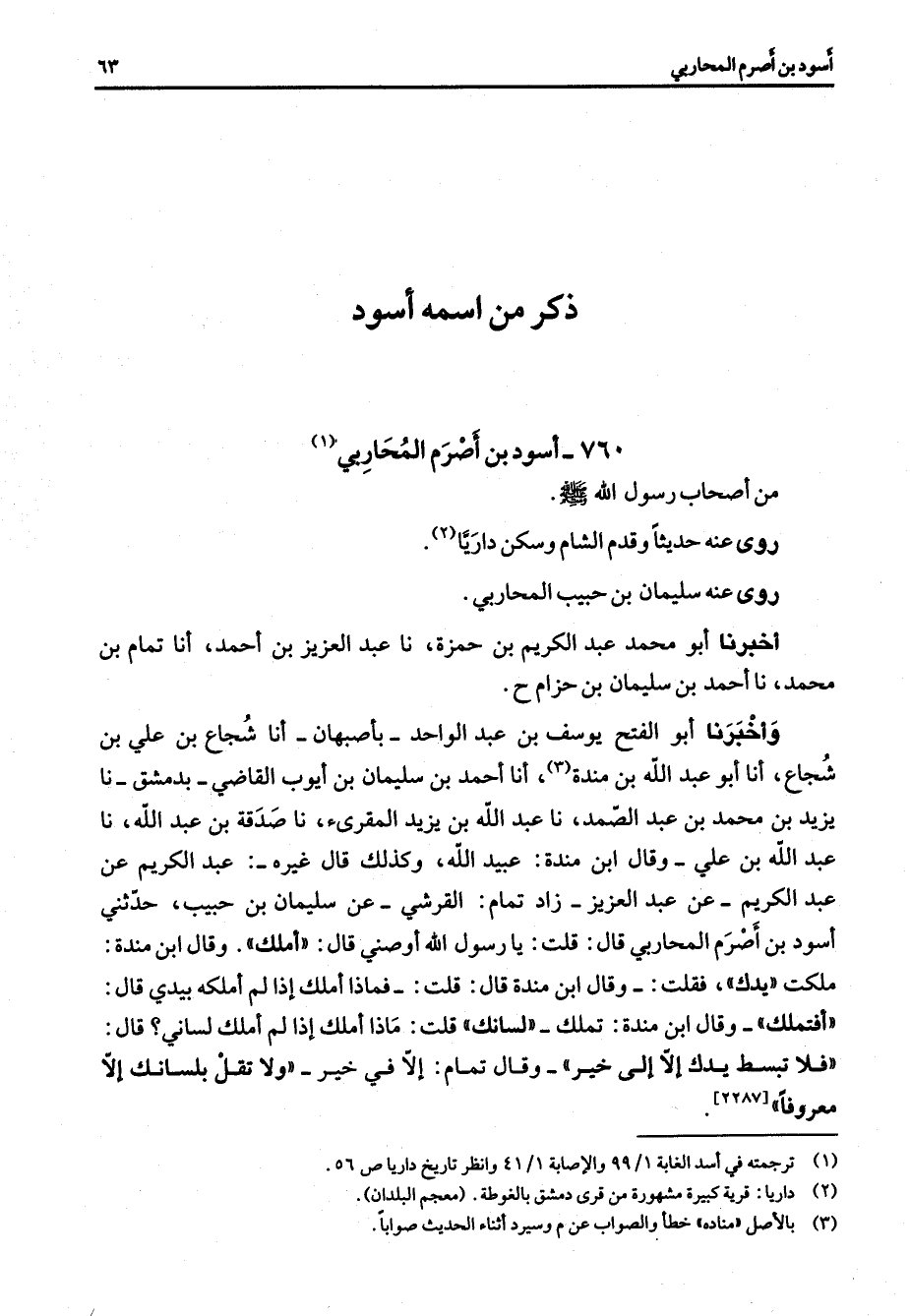 760 - أسود بن اصرم المحاربي (1) من أصحاب رسول الله (صلى الله عليه وسلم) روى عنه حديثا وقدم الشام وسكن داريا (2) روى عنه سليمان بن حبيب المحاربي أخبرنا أبو محمد عبد الكريم بن حمزة نا عبد العزيز بن أحمد أنا تمام بن محمد نا أحمد بن سليمان بن حزام وأخبرنا أبو الفتح يوسف بن عبد الواحد بأصبهان أنا شجاع بن علي بن شجاع أنا أبو عبد الله بن مندة (3) أنا أحمد بن سليمان بن أيوب القاضي بدمشق نا يزيد بن محمد بن عبد الصمد نا عبد الله بن يزيد المقرئ نا صدقة بن عبد الله نا عبد الله بن علي وقال ابن مندة عبيد الله وكذلك قال غيره عبد الكريم عن عبد الكريم عن عبد العزيز زاد تمام القرشي عن سليمان بن حبيب حدثني أسود بن أصرم المحاربي قال قلت يا رسول الله أوصني قال أملك وقال ابن مندة ملكت يدك فقلت وقال ابن مندة قال قلت فماذا أملك إذا لم أملكه بيدي قال أفتملك وقال ابن مندة تملك لسانك قلت ماذا أملك إذا لم أملك لساني قال فلا تبسط يدك إلا إلى خير وقال تمام إلا في خير ولا تقل بلسانك إلا معروفا