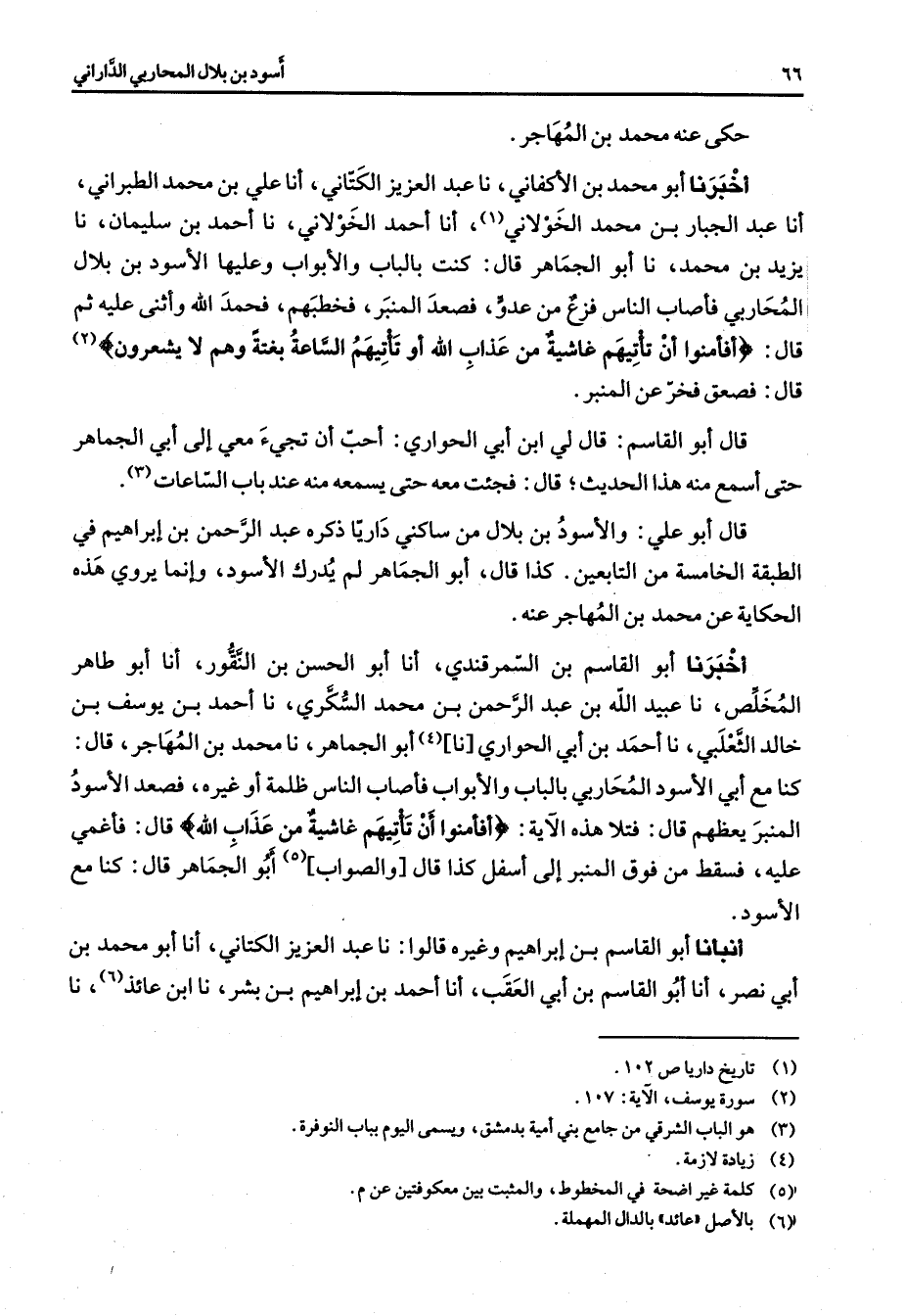حكى عنه محمد بن المهاجر أخبرنا أبو محمد بن الأكفاني نا عبد العزيز الكتاني أنا علي بن محمد الطبراني أنا عبد الجبار بن محمد الخولاني (1) أنا أحمد الخولاني نا أحمد بن سليمان نا يزيد بن محمد نا أبو الجماهر قال كنت بالباب والأبواب وعليها الأسود بن بلال المحاربي فأصاب الناس فزع من عدو فصعد المنبر فخطبهم فحمد الله وأثنى عليه ثم قال " افأمنوا أن تأتيهم غاشية من عذاب الله أو تأتيهم الساعة بغتة وهم لا يشعرون " (2) قال فصعق فخر عن المنبر قال أبو القاسم قال لي ابن أبي الحواري أحب أن تجئ معي إلى أبي الجماهر حتى أسمع منه هذا الحديث قال فجئت معه حتى يسمعه منه عند باب الساعات (3) قال أبو علي والأسود بن بلال من ساكني داريا ذكره عبد الرحمن بن إبراهيم في الطبقة الخامسة من التابعين كذا قال أبو الجماهر لم يدرك الأسود وإنما يروي هذه الحكاية عن محمد بن المهاجر عنه أخبرنا أبو القاسم بن السمرقندي أنا أبو الحسن بن النقور أنا أبو طاهر المخلص نا عبيد الله بن عبد الرحمن بن محمد السكري نا أحمد بن يوسف بن خالد الثعلبي نا أحمد بن أبي الحواري نا (4) أبو الجماهر نا محمد بن المهاجر قال كنا مع أبي الأسود المحاربي بالباب والأبواب فأصاب الناس ظلمة أو غيره فصعد الأسود المنبر يعظهم قال فتلا هذه الآية " أفأمنوا أن تأتيهم غاشية من عذاب الله " قال فأغمي عليه فسقط من فوق المنبر إلى أسفل كذا قال والصواب (5) أبو الجماهر قال كنا مع الأسود أنبانا أبو القاسم بن إبراهيم وغيره قالوا نا عبد العزيز الكتاني أنا أبو محمد بن أبي نصر أنا أبو القاسم بن أبي العقب أنا أحمد بن إبراهيم بن بشر نا ابن عائذ (6) نا