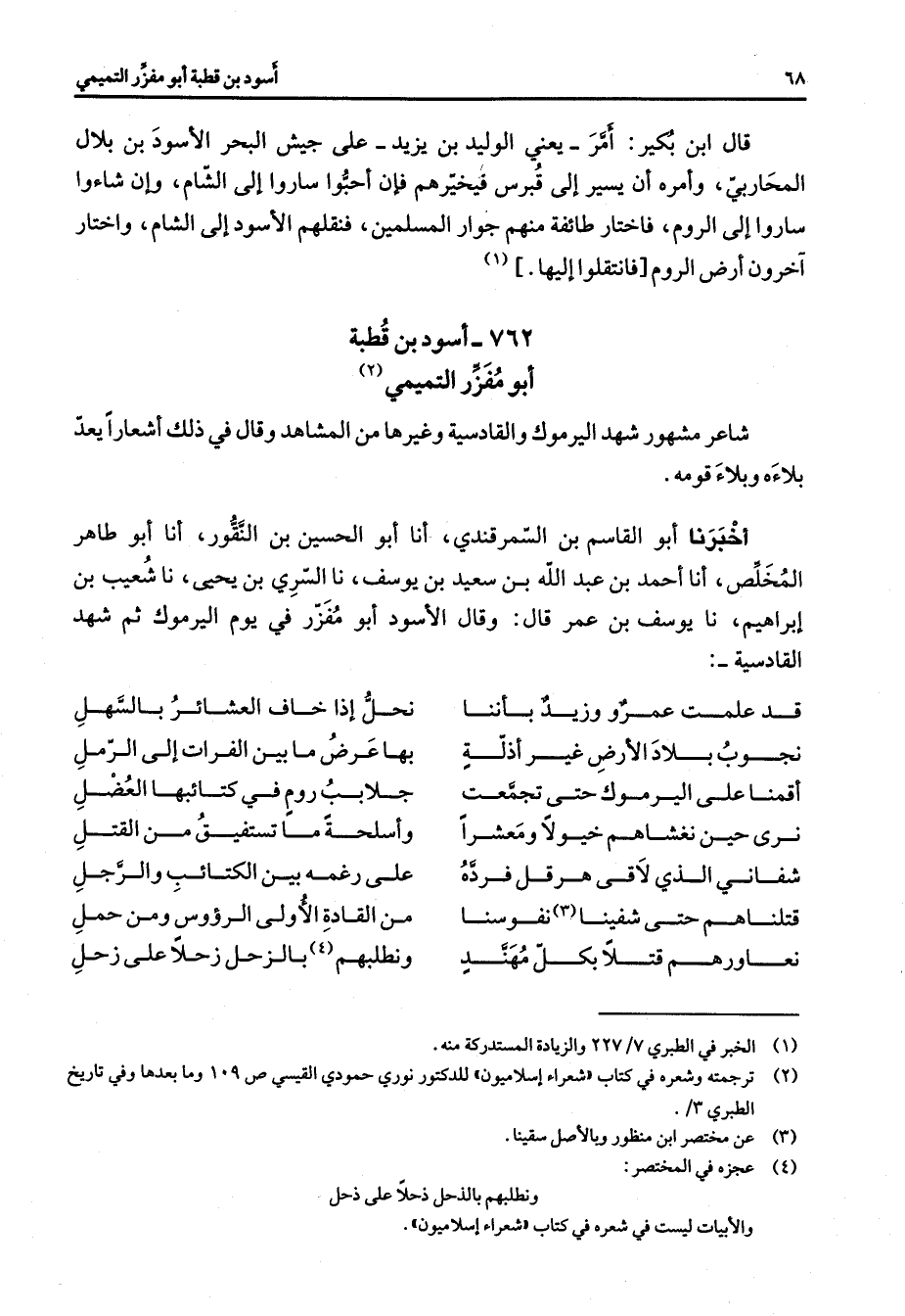 762 - أسود بن قطبة أبو مفرز التميمي (2) شاعر مشهور شهد اليرموك والقادسية وغيرها من المشاهد وقال في ذلك أشعارا يعد بلاءه وبلاء قومه أخبرنا أبو القاسم بن السمرقندي أنا أبو الحسين بن النقور أنا أبو طاهر المخلص أنا أحمد بن عبد الله بن سعيد بن يوسف نا السري بن يحيى نا شعيب بن إبراهيم نا يوسف بن عمر قال وقال الأسود أبو مفزر في يوم اليرموك ثم شهد القادسية * قد علمت عمرو وزيد بأننا * نحل إذا خاف العشائر بالسهل نجوب بلاد الأرض غير أذلة * بها عرض ما بين الفرات إلى الرمل أقمنا على اليرموك حتى تجمعت * جلابب روم في كتائبها العضل نرى حين نغشاهم خيولا ومعشرا * وأسلحة ما تستفيق من القتل شفاني الذي لاقى هرقل فرده * على رغمه بين الكتائب والرجل قتلناهم حتى شفينا (3) نفوسنا * من القادة الأولى الرؤوس ومن حمل نعاورهم قتلا بكل مهند * ونطلبهم (4) بالزجل زحلا على زحل *