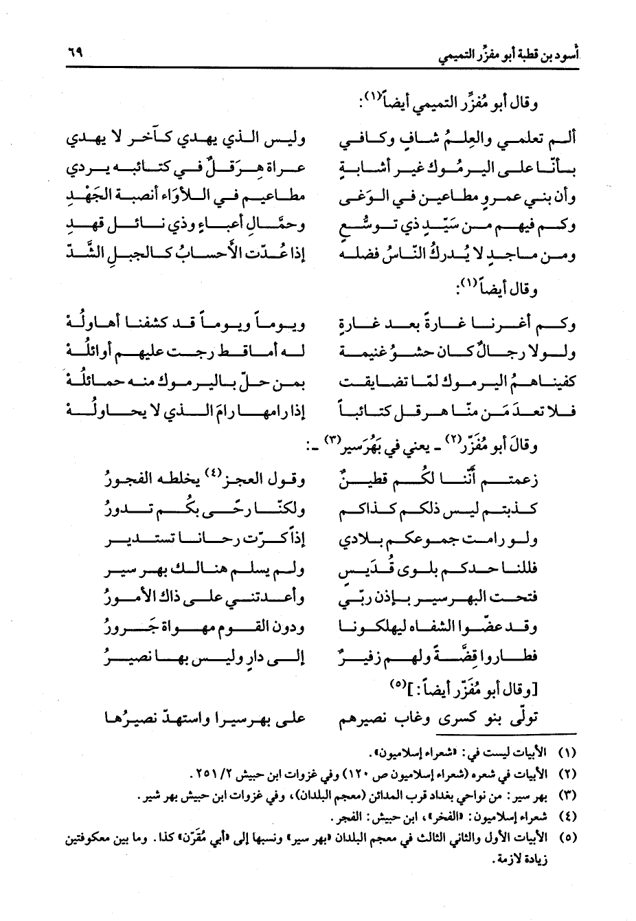 وقال أبو مفزر التميمي أيضا * (1) (1) ألم تعلمي والعلم شاف وكافي * وليس الذي يهدي كآخر لا يهدي بأنا على اليرموك غير أشابة * عراة هرقل في كتائبه يردي وأن بني عمرو مطاعين في الوغى * مطاعيم في اللأواء أنصبة الجهد وكم فيهم من سيد ذي توسع * وحمال أعباء وذي نائل قهد ومن ماجد لا يدرك الناس فضله * إذا عدت الأحساب كالجبل الشد * وقال أيضا * (1) وكم أغرنا غارة بعد غارة * ويوما ويوما قد كشفنا أهاوله ولولا رجال كان حشو غنيمة * له أما قط رجت عليهم أوائلة كفيناهم اليرموك لما تضايقت * بمن حل باليرموك منه حمائله فلا تعد من منا هرقل كتائبا * إذا رامها الذي لا يحاوله * وقال أبو مفزر (2) يعني في بهرسير * (3) زعمتم أننا لكم قطين * وقول العجز يخلطه الفجور (4) كذبتم ليس ذلكم كذاكم * ولكنا رحى بكم تدور ولو رامت جموعكم بلادي * إذا كرت رحانا تستدير فللنا حدكم بلوى قديس * ولم يسلم هنالك بهر سير فتحت البهر سير بإذن ربي * وأعدتني على ذاك الأمور وقد عضوا الشفاه ليهلكونا * ودون القوم مهواة جرور فطاروا قضة ولهم زفير * إلى دار وليس بها نصير * وقال أبو مفزر أيضا * (5) تولى بنو كسرى وغاب نصيرهم * على بهر سيرا واستهد نصيرها