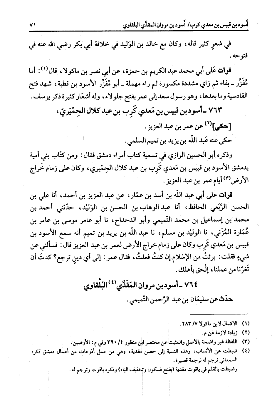 (4) ضبطت عن الأنساب وهذه النسبة إلى حصن مقدية وهي من عمل أذرعات من أعمال دمشق ذكره السمعاني ترجم له ترجمة قصيرة