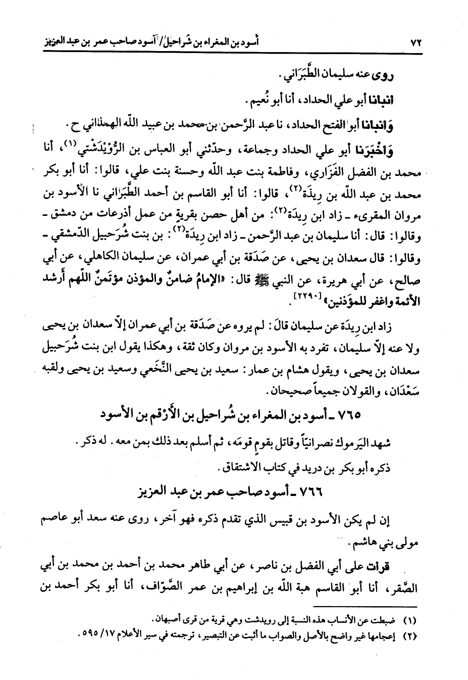 روى عنه سليمان الطبراني أنبأنا أبو علي الحداد أنا أبو نعيم وأنبأنا أبو الفتح الحداد نا عبد الرحمن بن محمد بن عبيد الله الهمذاني وأخبرنا أبو علي الحداد وجماعة وحدثني أبو العباس بن الرويدشتي (1) أنا محمد بن الفضل الفزاري وفاطمة بنت عبد الله وحسنة بنت علي قالوا أنا أبو بكر محمد بن عبد الله بن ريذة قالوا أنا أبو القاسم بن أحمد الطبراني نا الأسود بن مروان المقرئ زاد ابن ريدة من أهل حصن بقرية من عمل أذرعات من دمشق وقالوا قال أنا سليمان بن عبد الرحمن زاد بن ريدة (2) بن بنت شرحبيل الدمشقي وقالوا قال سعدان بن يحيى عن صدقة بن أبي عمران عن سليمان الكاهلي عن أبي صالح عن أبي هريرة عن النبي (صلى الله عليه وسلم) قال الإمام ضامن والمؤذن مؤتمن اللهم أرشد الأئمة واغفر للمؤذنين زاد ابن ريدة عن سليمان قال لم يروه عن صدقة بن أبي عمران إلا سعدان بن يحيى ولا عنه إلا سليمان تفرد به الأسود بن مروان وكان ثقة وهكذا يقول ابن بنت شرحبيل سعدان بن يحيى ويقول هشام بن عمار سعيد بن يحيى النخعي وسعيد بن يحيي ولقبه سعدان والقولان جميعا صحيحان