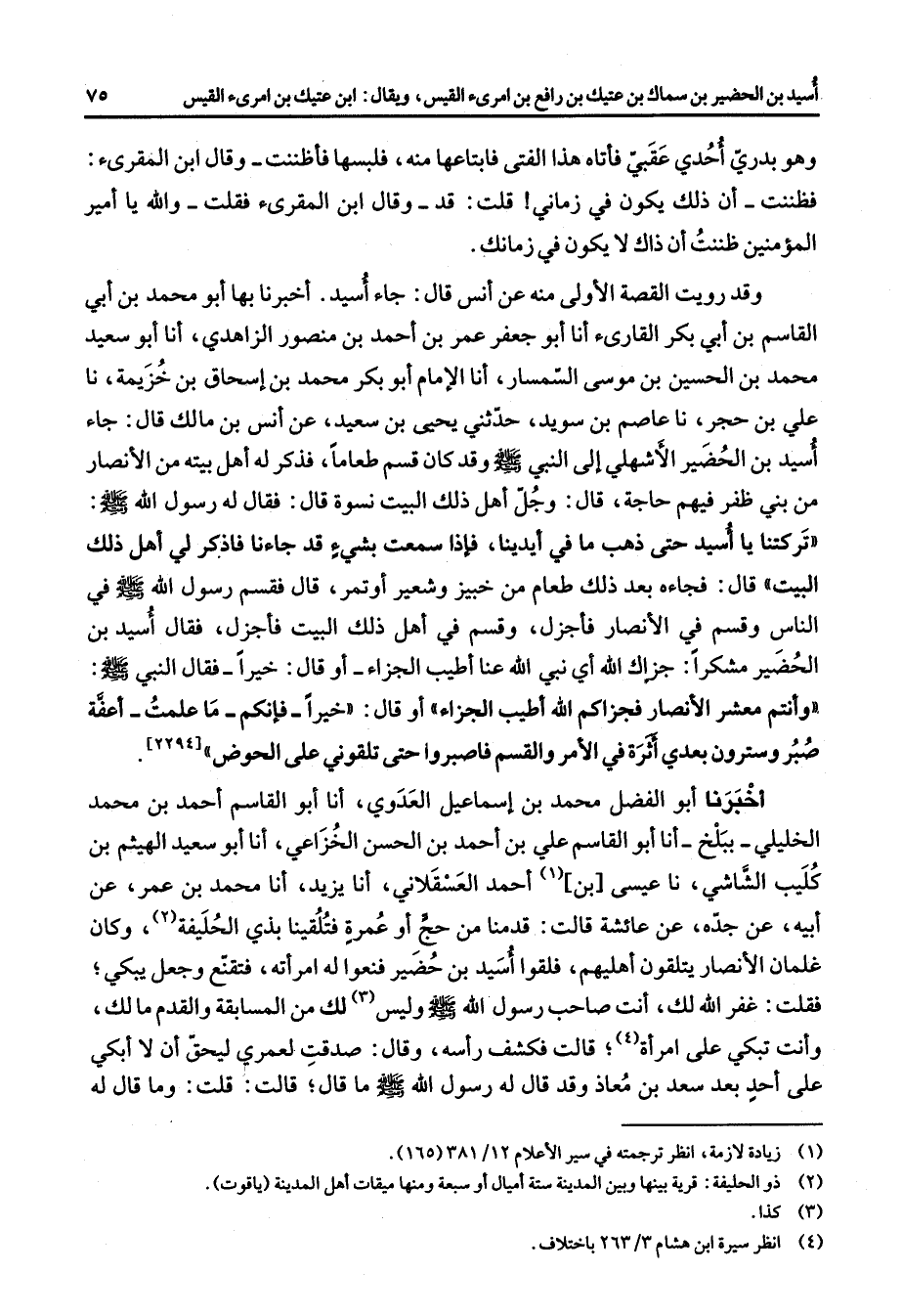 وهو بدري أحدي عقبي فأتاه هذا الفتى فابتاعها منه فلبسها فأظننت وقال ابن المقرئ فظننت أن ذلك يكون في زماني قلت قد وقال ابن المقرئ فقلت والله يا أمير المؤمنين ظننت أن ذاك لا يكون في زمانك وقد رويت القصة الأولى منه عن أنس قال جاء أسيد أخبرنا بها أبو محمد بن أبي القاسم بن أبي بكر القارئ أنا أبو جعفر عمر بن أحمد بن منصور الزاهدي أنا أبو سعيد محمد بن الحسين بن موسى السمسار أنا الإمام أبو بكر محمد بن إسحاق بن خزيمة نا علي بن حجر نا عاصم بن سويد حدثني يحيى بن سعيد عن أنس بن مالك قال جاء أسيد بن الحضير الأشهلي إلى النبي (صلى الله عليه وسلم) وقد كان قسم طعاما فذكر له أهل بيته من الأنصار من بني ظفر فيهم حاجة قال وجل أهل ذلك البيت نسوة قال فقال له رسول الله (صلى الله عليه وسلم) تركتنا يا أسيد حتى ذهب ما في أيدينا فإذا سمعت بشئ قد جاءنا فاذكر لي أهل ذلك البيت قال فجاءه بعد ذلك طعام من خبيز وشعير أو تمر قال فقسم رسول الله (صلى الله عليه وسلم) في الناس وقسم في الأنصار فأجزل وقسم في أهل ذلك البيت فأجزل فقال أسيد بن الحضير مشكرا جزاك الله أي نبي الله عنا أطيب الجزاء أو قال خيرا فقال النبي (صلى الله عليه وسلم) وأنتم معشر الأنصار فجزاكم الله أطيب الجزاء أو قال خيرا فإنكم ما علمت أعفة صبر وسترون بعدي أثرة في الأمر والقسم فاصبروا حتى تلقوني على الحوض أخبرنا أبو الفضل محمد بن إسماعيل العدوي أنا أبو القاسم أحمد بن محمد الخليلي ببلخ أنا أبو القاسم علي بن أحمد بن الحسن الخزاعي أنا أبو سعيد الهيثم بن كليب الشاشي نا عيسى بن (1) أحمد العسقلاني أنا يزيد أنا محمد بن عمر عن أبيه عن جده عن عائشة قالت قدمنا من حج أو عمرة فتلقينا بذي الحليفة (2) وكان غلمان الأنصار يتلقون أهليهم فلقوا أسيد بن خضير فنعوا له امرأته فتقنع وجعل يبكي فقلت غفر الله لك أنت صاحب رسول الله (صلى الله عليه وسلم) وليس (3) لك من المسابقة والقدم مالك وأنت تبكي على امرأة قالت فكشف رأسه وقال صدقت لعمري ليحق أن لا أبكي على أحد بعد سعد بن معاذ وقد قال له
