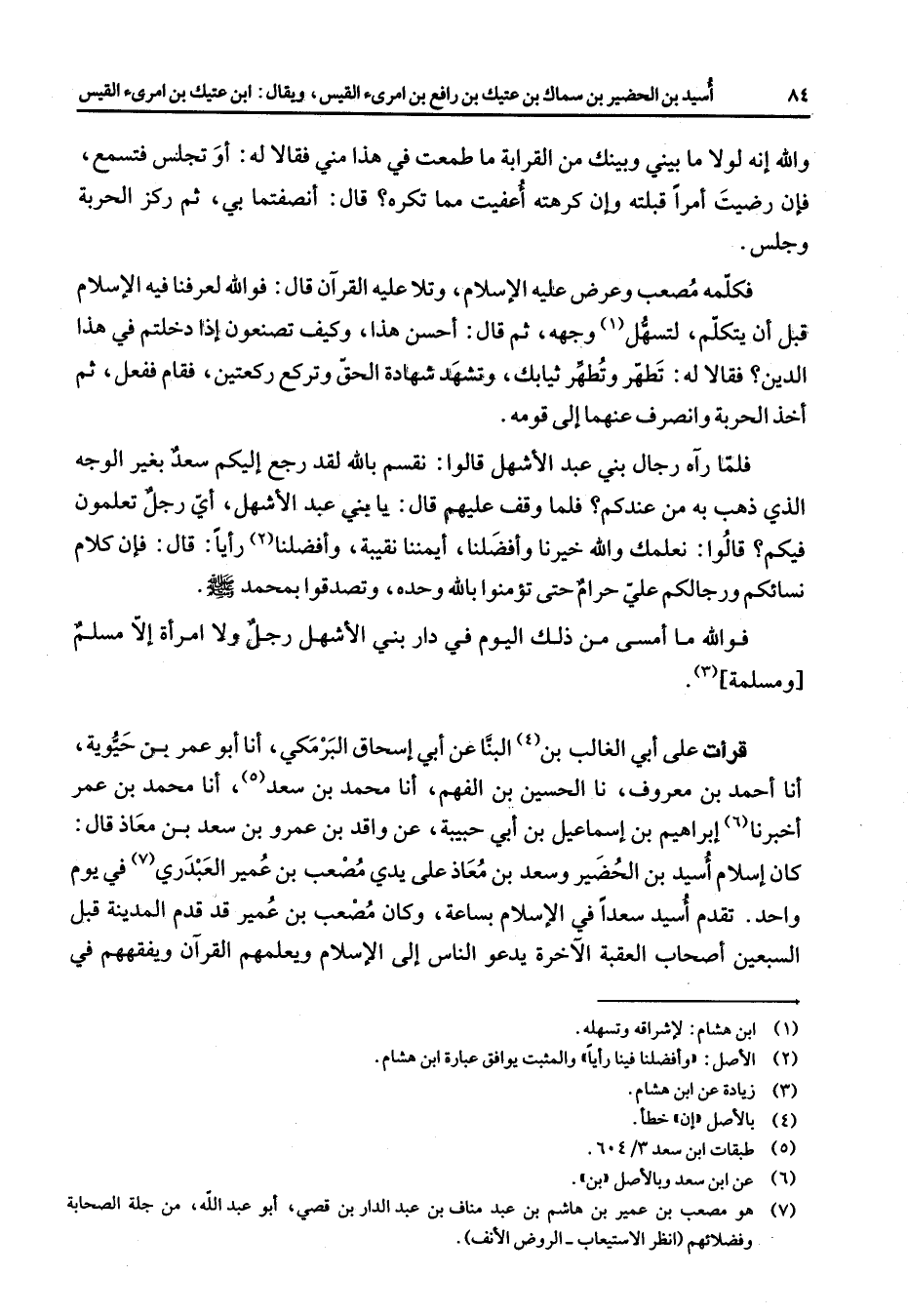 إبراهيم بن إسماعيل بن أبي حبيبة عن واقد بن عمرو بن سعد بن معاذ قال كان إسلام أسيد بن الحضير وسعد بن معاذ على يدي مصعب بن عمير العبدري (7)