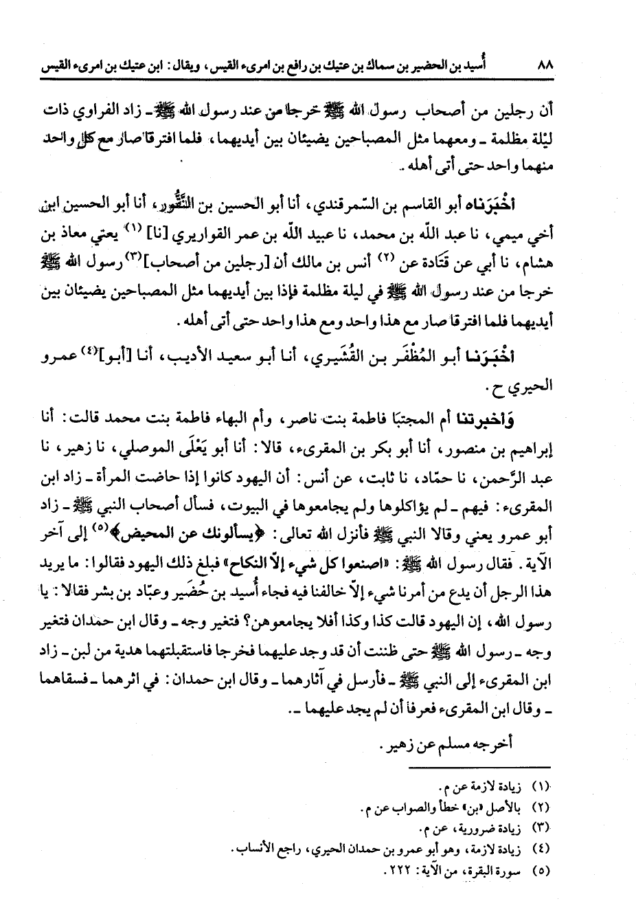 عمرو الحيري وأخبرتنا أم المجتبا فاطمة بنت ناصر وأم البهاء فاطمة بنت محمد قالت أنا إبراهيم بن منصور أنا أبو بكر بن المقرئ قالا أنا أبو يعلى الموصلي نا زهير نا عبد الرحمن نا حماد نا ثابت عن أنس أن اليهود كانوا إذا حاضت المرأة زاد ابن المقرئ فيهم لم يؤاكلوها ولم يجامعوها في البيوت فسأل أصحاب النبي (صلى الله عليه وسلم) زاد أبو عمرو يعني وقالا النبي (صلى الله عليه وسلم) فأنزل الله تعالى " يسألونك عن المحيض (5)