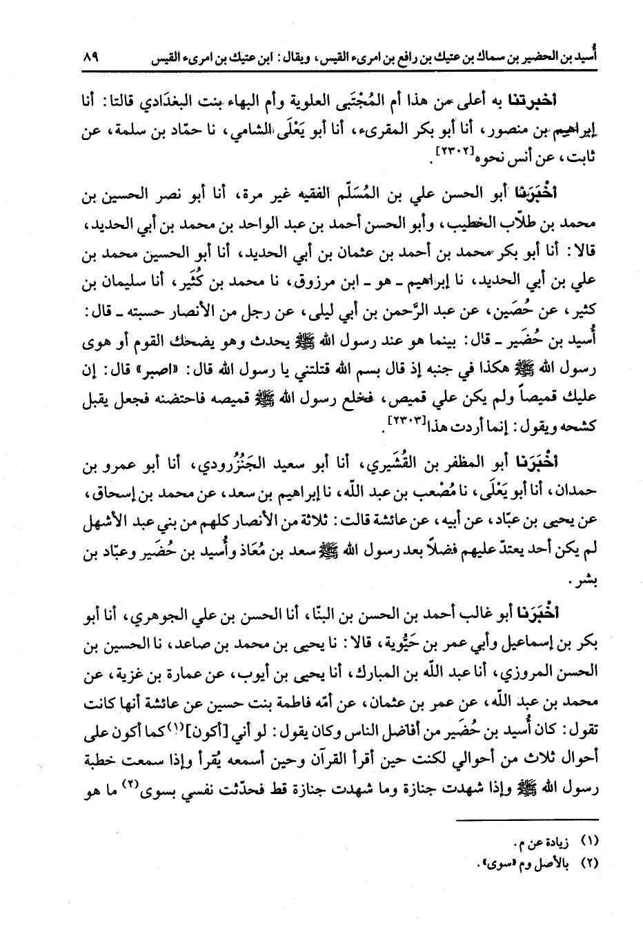 أخبرتنا به أعلى من هذا أم المجتبى العلوية وأم البهاء بنت البغدادي قالتا أنا إبراهيم بن منصور أنا أبو بكر المقرئ أنا أبو يعلى الشامي نا حماد بن سلمة عن ثابت عن أنس نحوه أخبرنا أبو الحسين علي بن المسلم الفقيه غير مرة أنا أبو نصر الحسين بن محمد بن طلاب الخطيب وأبو الحسن أحمد بن عبد الواحد بن محمد بن أبي الحديد قالا أنا أبو بكر محمد بن أحمد بن عثمان بن أبي الحديد أنا أبو الحسين محمد بن علي بن أبي الحديد نا إبراهيم هو ابن مرزوق نا محمد بن كثير أنا سليمان بن كثير عن حصين عن عبد الرحمن بن أبي ليلى عن رجل من الأنصار حسبته قال أسيد بن حضير قال بينما هو عند رسول الله (صلى الله عليه وسلم) يحدث وهو يضحك القوم أو هوى رسول الله (صلى الله عليه وسلم) هكذا في جنبه إذ قال بسم الله قتلتني يا رسول الله قال اصبر قال إن عليك قميصا ولم يكن علي قميص فخلع رسول الله (صلى الله عليه وسلم) قميصه فاحتضنه فجعل يقبل كشحه ويقول إنما أردت هذا أخبرنا أبو المظفر بن القشيري أنا أبو سعيد الجنزرودي أنا أبو عمرو بن حمدان أنا أبو يعلى نا مصعب بن عبد الله نا إبراهيم بن سعد عن محمد بن إسحاق عن يحيى بن عباد عن أبيه عن عائشة قالت ثلاثة من الأنصار كلهم من بني عبد الأشهل لم يكن أحد يعتد عليهم فضلا بعد رسول الله (صلى الله عليه وسلم) سعد بن معاذ وأسيد بن حضير وعباد بن بشر أخبرنا أبو غالب أحمد بن الحسن بن البنا أنا الحسن بن علي الجوهري أنا أبو بكر بن إسماعيل وأبي عمر بن حيوية قالا نا يحيى بن محمد بن صاعد نا الحسين بن الحسن المروزي أنا عبد الله بن المبارك أنا يحيى بن أيوب عن عمارة بن غزية عن محمد بن عبد الله عن عمر بن عثمان عن أمة فاطمة بنت حسين عن عائشة أنها كانت تقول كان أسيد بن حضير من أفاضل الناس وكان يقول لو أني أكون (1) كما أكون على أحوال ثلاث من أحوالي لكنت حين أقرأ القرآن وحين أسمعه يقرا وإذا سمعت خطبه رسول الله (صلى الله عليه وسلم) وإذا شهدت جنازة وما شهدت جنازة قط فحدثت نفسي بسوى (2) ما هو