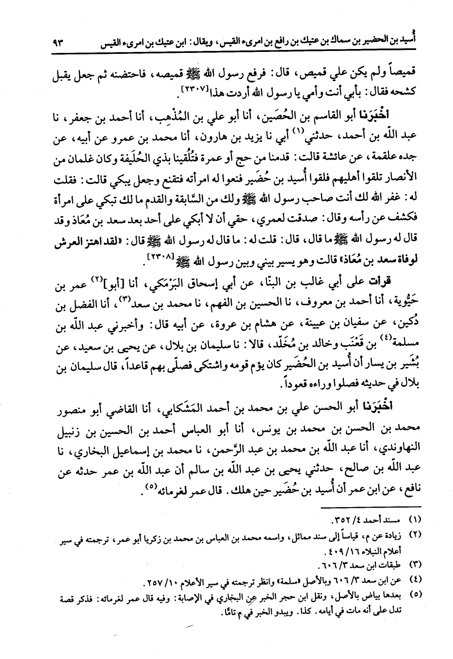 قميصا ولم يكن علي قميص قال فرفع رسول الله (صلى الله عليه وسلم) قميصه فاحتضنه ثم جعل يقبل كشحه فقال بأبي أنت وأمي يا رسول الله أردت هذا أخبرنا أبو القاسم بن الحصين أنا أبو علي بن المذهب أنا أحمد بن جعفر نا عبد الله بن أحمد حدثني (1) أبي نا يزيد بن هارون أنا محمد بن عمرو عن أبيه عن جده علقمة عن عائشة قالت قدمنا من حج أو عمرة فتلقينا بذي الحليفة وكان غلمان من الأنصار تلقوا أهليهم فلقوا أسيد بن حضير فنعوا له امرأته فتقنع وجعل يبكي قالت فقلت له غفر الله لك أنت صاحب رسول الله (صلى الله عليه وسلم) ولك من السابقة والقدم ما لك تبكي على أمرأة فكشف عن رأسه وقال صدقت لعمري حقي أن لا أبكي على أحد بعد سعد بن معاذ وقد قال له رسول الله (صلى الله عليه وسلم) ما قال قال قلت له ما قال له رسول الله (صلى الله عليه وسلم) قال لقد اهتز العرش لوفاة سعد بن معاذ قالت وهو يسير بيني وبين رسول الله (صلى الله عليه وسلم) قرأت على أبي غالب بن البنا عن أبي إسحاق البرمكي أنا أبو (2) عمر بن حيوية أنا أحمد بن معروف نا الحسين بن الفهم نا محمد بن سعد (3) أنا الفضل بن دكين عن سفيان بن عيينة عن هشام بن عروة عن أبيه قال وأخبرني عبد الله بن مسلمة (4) بن قعنب وخالد بن مخلد قالا نا سليمان بن بلال عن يحيى بن سعيد عن بشير بن يسار أن أسيد بن الحضير كان يؤم قومه واشتكى فصلى بهم قاعدا قال سليمان بن بلال في حديثه فصلوا وراءه قعودا أخبرنا أبو الحسن علي بن محمد بن أحمد المشكابي أنا القاضي أبو منصور محمد بن الحسن بن محمد بن يونس أنا أبو العباس احمد بن الحسين بن زنبيل النهاوندي أنا عبد الله بن محمد بن عبد الرحمن نا محمد بن إسماعيل البخاري نا عبد الله بن صالح حدثني يحيى بن عبد الله بن سالم أن عبد الله بن عمر حدثه عن نافع عن ابن عمر أن أسيد بن حضير حين هلك قال عمر لغرمائه (5)