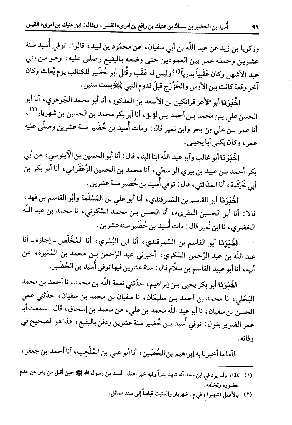 (1) كذا ولم في ابن سعد أنه شهد بدرا وفيه خبر اعتذار أسيد من رسول الله صلى الله عليه وسلم حين أقبل من بدر عن عدم حضوره وتخلفه