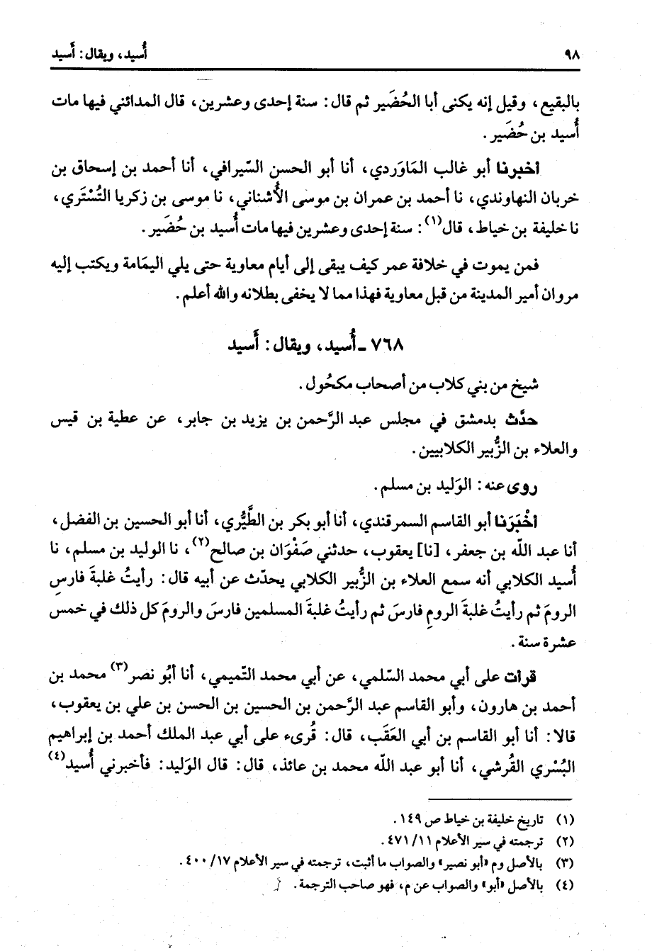 768 - أسيد ويقال أسيد شيخ من بني كلاب من أصحاب مكحول حدث بدمشق في مجلس عبد الرحمن بن يزيد بن جابر عن عطية بن قيس والعلاء بن الزبير الكلابيين روى عنه الوليد بن مسلم أخبرنا أبو القاسم السمرقندي أنا أبو بكر بن الطيري أنا أبو الحسين بن الفضل أنا عبد الله بن جعفر نا يعقوب حدثني صفوان بن صالح (2) نا الوليد بن مسلم نا أسيد الكلابي أنه سمع العلاء بن الزبير الكلابي يحدث عن أبيه قال رأيت غلبة فارس الروم ثم رأيت غلبة الروم فارس ثم رأيت غلبة المسلمين فارس والروم كل ذلك في خمس عشرة سنة قرأت على أبي محمد السلمي عن أبي محمد التميمي أنا أبو نصر محمد (3) بن أحمد بن هارون وأبو القاسم عبد الرحمن بن الحسين بن الحسن بن علي بن يعقوب قالا أنا أبو القاسم بن أبي العقب قال قرئ على أبي عبد الملك أحمد بن إبراهيم البسري القرشي أنا أبو عبد الله محمد بن عائذ قال قال الوليد فأخبرني أسيد (4)