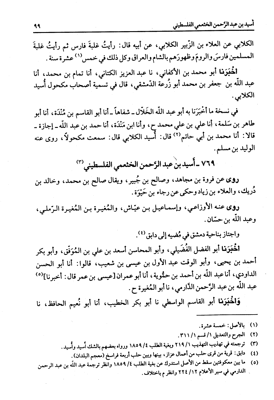 769 - أسيد بن عبد الرحمن الخثعمي الفلسطيني (3) روى عن فروة بن مجاهد وصالح بن جبير ويقال صالح بن محمد وخالد بن دريك والعلاء بن زياد وحكى عن رجاء بن حيوة روى عنه الأوزاعي وإسماعيل بن عياش والمغيرة بن المغيرة الرملي وعبد الله بن حسان واجتاز بناحية دمشق في مضيه إلى دابق (4) أخبرنا أبو الفضل الفضيلي وأبو المحاسن أسعد بن علي بن الموفق وأبو بكر أحمد بن يحيى وأبو الوقت عبد الأول بن عيسى بن شعيب قالوا أنا أبو الحسن الداودي أنا عبد الله بن أحمد بن حموية أنا أبو عمران عيسى بن عمر قال أخبرنا (5) عبد الله بن عبد الرحمن الدارمي نا أبو المغيرة وأخبرنا أبو القاسم الواسطي نا أبو بكر الخطيب أنا أبو نعيم الحافظ نا