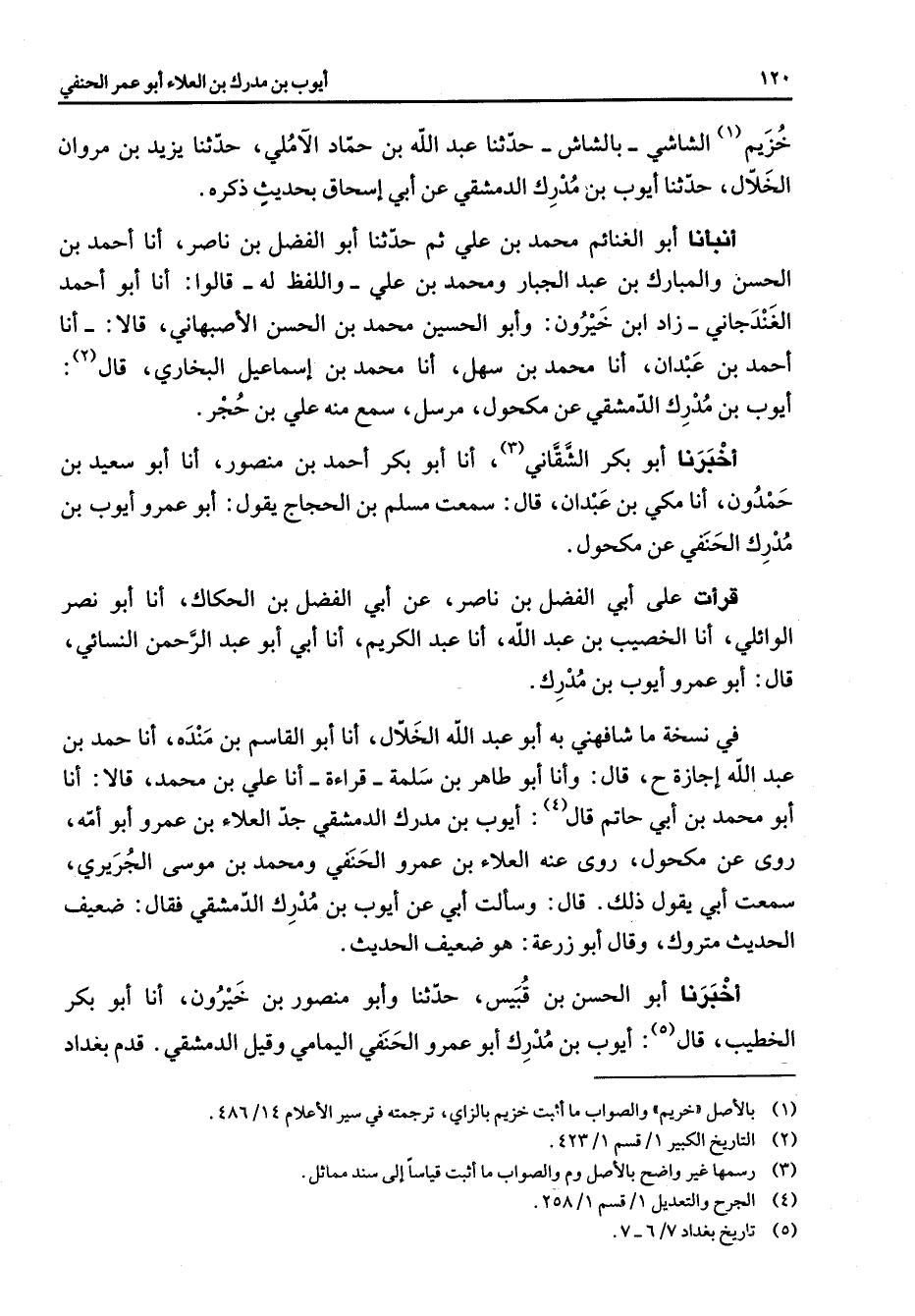 خزيم (1) الشاشي بالشاش حدثنا عبد الله بن حماد الآملي حدثنا يزيد بن مروان الخلال حدثنا أيوب بن مدرك الدمشقي عن أبي إسحاق بحديث ذكره أنبأنا أبو الغنائم محمد بن علي ثم حدثنا أبو الفضل بن ناصر أنا أحمد بن الحسن والمبارك بن عبد الجبار ومحمد بن علي واللفظ له قالوا أنا أبو أحمد الغندجاني زاد ابن خيرون وأبو الحسين محمد بن الحسن الأصبهاني قالا أنا أحمد بن عبدان أنا محمد بن سهل أنا محمد بن إسماعيل البخاري قال (2) أيوب بن مدرك الدمشقي عن مكحول مرسل سمع منه علي بن حجر أخبرنا أبو بكر الشقاني (3) أنا أبو بكر أحمد بن منصور أنا أبو سعيد بن حمدون أنا مكي بن عبدان قال سمعت مسلم بن الحجاج يقول أبو عمرو أيوب بن مدرك الحنفي عن مكحول قرأت على أبي الفضل بن ناصر عن أبي الفضل بن الحكاك أنا أبو نصر الوائلي أنا الخصيب بن عبد الله أنا عبد الكريم أنا أبي أبو عبد الرحمن النسائي قال أبو عمرو أيوب بن مدرك في نسخة ما شافهني به أبو عبد الله الخلال أنا أبو القاسم بن منده أنا حمد بن عبد الله إجازة قال وأنا أبو طاهر بن سلمة قراءة أنا علي بن محمد قالا أنا أبو محمد بن أبي حاتم قال (4) أيوب بن مدرك الدمشقي جد العلاء بن عمرو أبو أمه روى عن مكحول روى عنه العلاء بن عمرو الحنفي ومحمد بن موسى الجريري سمعت أبي يقول ذلك قال وسألت أبي عن أيوب بن مدرك الدمشقي فقال ضعيف الحديث متروك وقال أبو زرعة هو ضعيف الحديث أخبرنا أبو الحسن بن قبيس حدثنا وأبو منصور بن خيرون أنا أبو بكر الخطيب قال (5) أيوب بن مدرك أبو عمرو الحنفي اليمامي وقيل الدمشقي قدم بغداد