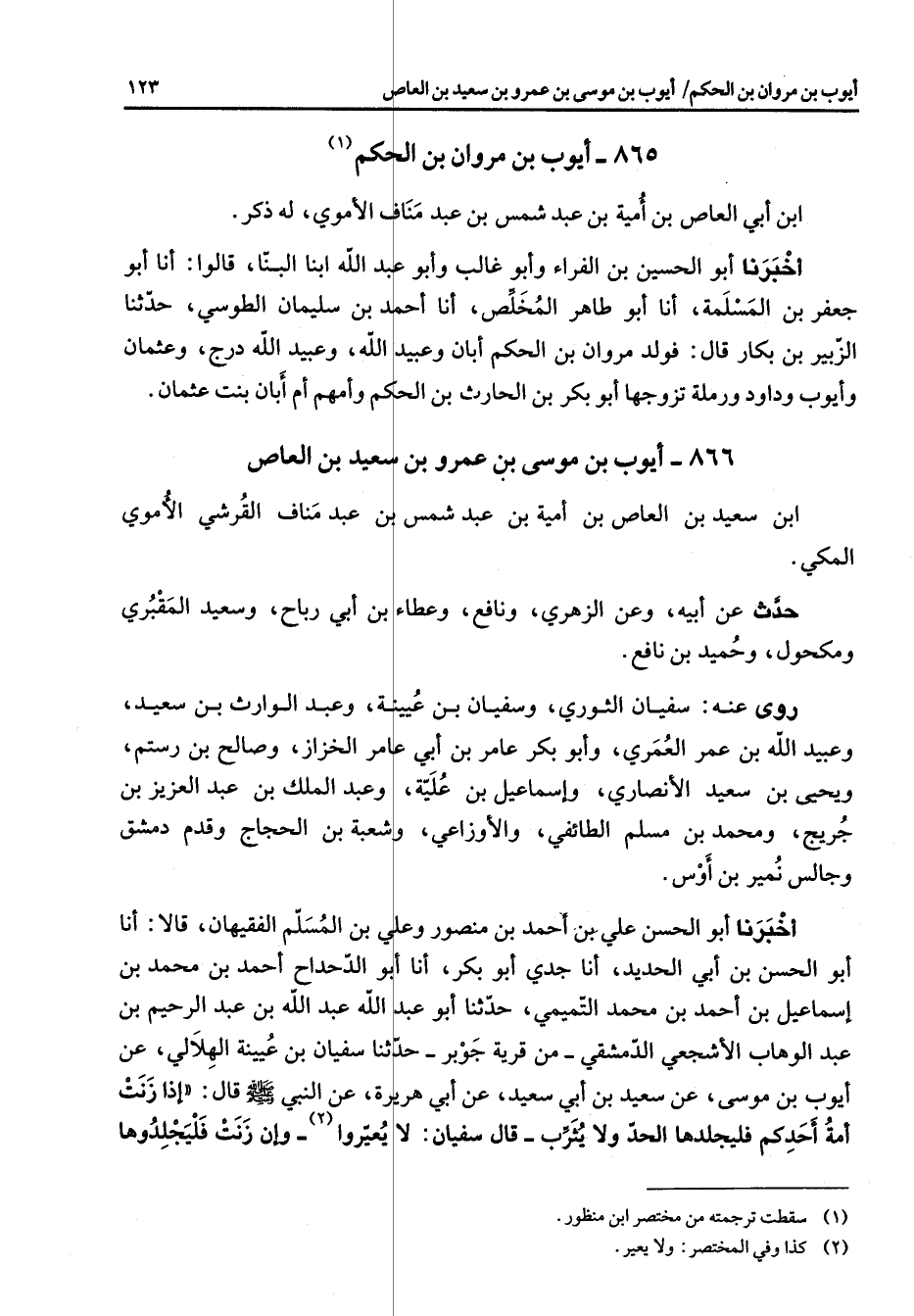 866 - أيوب بن موسى بن عمرو بن سعيد بن العاص ابن سعيد بن العاص بن أمية بن عبد شمس بن عبد مناف القرشي الأموي المكي حدث عن أبيه وعن الزهري ونافع وعطاء بن أبي رباح وسعيد المقبري ومكحول وحميد بن نافع روى عنه سفيان الثوري وسفيان بن عيينة وعبد الوارث بن سعيد وعبيد الله بن عمر العمري وأبو بكر عامر بن أبي عامر الخزاز وصالح بن رستم ويحيى بن سعيد الأنصار وإسماعيل بن علية وعبد الملك بن عبد العزيز بن جريج ومحمد بن مسلم الطائف والأوزاعي وشعبة بن الحجاج وقدم دمشق وجالس نمير بن أوس أخبرنا أبو الحسن علي بن أحمد بن منصور وعلي بن المسلم الفقيهان قالا أنا أبو الحسن بن أبي الحديد أنا جدي أبو بكر أنا أبو الدحداح أحمد بن محمد بن إسماعيل بن أحمد بن محمد التميمي حدثنا أبو عبد الله عبد الله بن عبد الرحيم بن عبد الوهاب الأشجعي الدمشقي من قرية جوبر حدثنا سفيان بن عيينة الهلالي عن أيوب بن موسى عن سعيد بن أبي سعيد عن أبي هريرة عن النبي (صلى الله عليه وسلم) قال إذا زنت أمة أحدكم فليجلدها الحد ولا يثرب قال سفيان لا يعيروا (2) وإن زنت فليجلدوها