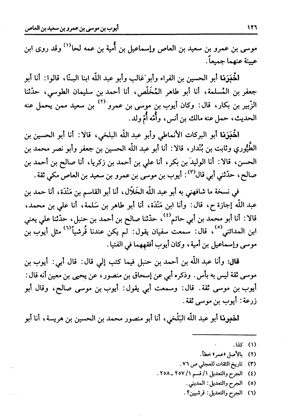 موسى بن عمرو بن سعيد بن العاص وإسماعيل بن أمية بن عمه لحا (1) وقد روى ابن عيينة عنهما جميعا أخبرنا أبو الحسين بن الفراء وأبو غالب وأبو عبد الله ابنا البنا قالوا أنا أبو جعفر بن المسلمة أنا أبو طاهر المخلص أنا أحمد بن سليما الطوسي حدثنا الزبير بن بكار قال وكان أيوب بن موسى بن عمرو (2) بن سعيد ممن يحمل عنه الحديث حمل عنه مالك بن أنس وأمه أم ولد أخبرنا أبو البركات الأنماطي وأبو عبد الله البلخي قالا أنا أبو الحسين بن الطيوري وثابت بن بندار قالا أنا أبو عبد الله الحسين بن جعفر وأبو نصر محمد بن الحسن قالا أنا الوليد بن بكر أنا علي بن أحمد بن زكريا أنا صالح بن أحمد بن صالح حدثني أبي قال (3) أيوب بن موسى بن عمرو بن سعيد بن العاص مكي ثقة في نسخة ما شافهني به أبو عبد الله الخلال أنا أبو القاسم بن مندة أنا حمد بن عبد الله إجازة قال وأنا ابن مندة أنا أبو طاهر بن سلمة أنا علي بن محمد قالا أنا أبو محمد بن أبي حاتم (4) حدثنا صالح بن أحمد بن حنبل حدثنا علي يعني ابن المدائني (5) قال سمعت سفيان يقول لم يكن عندنا قرشيا (6) مثل أيوب بن موسى وإسماعيل بن أمية وكان أيوب أفقههما في الفتيا قال وأنا عبد الله بن أحمد بن حنبل فيما كتب إلي قال قال أبي أيوب بن موسى ثقة ليس به بأس وذكره أبي عن إسحاق بن منصور عن يحيى بن معين أنه قال أيوب بن موسى ثقة ليس به بأس وذكره أبي عن إسحاق بن منصور عن يحيى بن معين أنه قال أيوب بن موسى ثقة قال وسمعت أبي يقول أيوب بن موسى صالح وقال أبو زرعة أيوب بن موسى ثقة أخبرنا أبو عبد الله البلخي أنا أبو منصور محمد بن الحسين بن هريسة أنا أبو