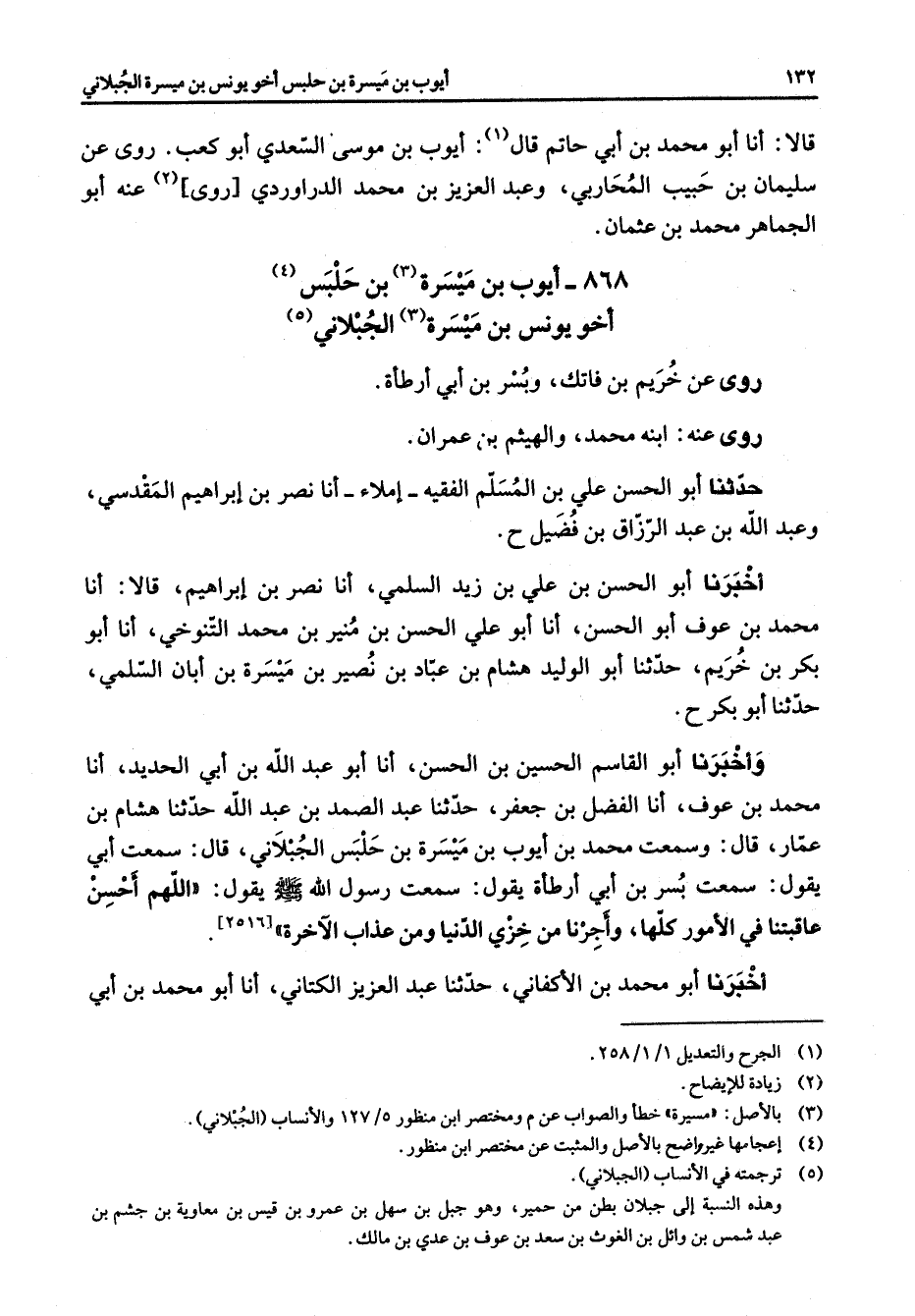 868 - أيوب بن ميسرة (3) بن حلبس (4) أخو يونس بن ميسرة (3) الجبلاني (5) روى عن خريم بن فاتك وبسر بن أبي أرطأة روى عنه ابنه محمد والهيثم بن عمران حدثنا أبو الحسن علي بن المسلم الفقيه إملاء أنا نصر بن إبراهيم المقدسي وعبد الله بن عبد الرزاق بن فضيل أخبرنا أبو الحسن بن علي بن زيد السلمي أنا نصر بن إبراهيم قالا أنا محمد بن عوف أبو الحسن أنا أبو علي الحسن بن منير بن محمد التنوخي أنا أبو بكر بن خريم حدثنا أبو الوليد هشام بن عباد بن نصير بن ميسرة بن أبان السلمي حدثنا أبو بكر وأخبرنا أبو القاسم الحسين بن الحسن أنا أبو عبد الله بن أبي الحديد أنا محمد بن عوف أنا الفضل بن جعفر حدثنا عبد الصمد بن عبد الله حدثنا هشام بن عمار قال وسمعت محمد بن أيوب بن ميسرة بن حلبس الجبلاني قال سمعت أبي يقول سمعت بسر بن أبي أرطأة يقول سمعت رسول الله (صلى الله عليه وسلم) يقول اللهم أحسن عاقبتنا في الأمور كلها وأجرنا من خزي الدنيا ومن عذاب الآخرة أخبرنا أبو محمد بن الأكفاني حدثنا عبد العزيز الكتاني أنا أبو محمد بن أبي