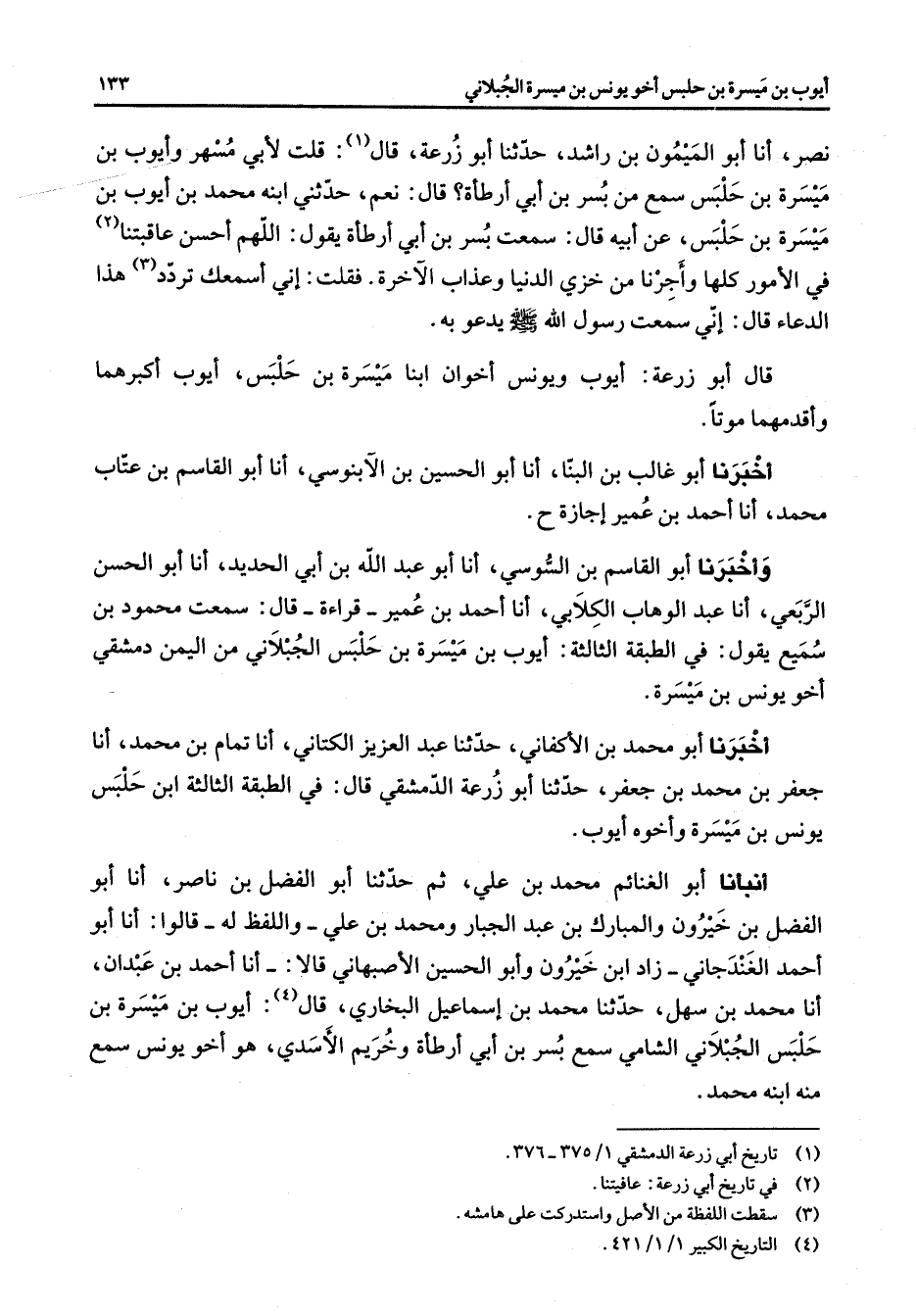 نصر أنا أبو الميمون بن راشد حدثنا أبو زرعة قال (1) قلت لأبي مسهر وأيوب بن ميسرة بن حلبس سمع من بسر بن أبي أرطأة قال نعم حدثني ابنه محمد بن أيوب بن ميسرة بن حلبس عن أبيه قال سمعت بسر بن أبي أرطأة يقول اللهم أحسن عاقبتنا (2) في الأمور كلها وأجرنا من خزي الدنيا وعذاب الآخرة فقلت إني أسمعك تردد (3) هذا الدعاء قال إني سمعت رسول الله (صلى الله عليه وسلم) يدعو به قال أبو زرعة أيوب ويونس أخوان ابنا ميسرة بن حلبس أيوب أكبرهما وأقدمهما موتا أخبرنا أبو غالب بن البنا أنا أبو الحسين بن الابنوسي أنا أبو القاسم بن عتاب محمد أنا أحمد بن عمير إجازة وأخبرنا أبو القاسم بن السوسي أنا أبو عبد الله بن أبي الحديد أنا أبو الحسن الربعي أنا عبد الوهاب الكلابي انا أحمد بن عمير قراءة قال سمعت محمود بن سميع يقول في الطبقة الثالثة أيوب بن ميسرة بن حلبس الجبلاني من اليمن دمشقي أخو يونس بن ميسرة أخبرنا أبو محمد بن الأكفاني حدثنا عبد العزيز الكتاني أنا تمام بن محمد انا جعفر بن محمد بن جعفر حدثنا أبو زرعة الدمشقي قال في الطبقة الثالثة ابن حلبس يونس بن ميسرة وأخوه أيوب أنبأنا أبو الغنائم محمد بن علي ثم حدثنا أبو الفضل بن ناصر أنا أبو الفضل بن خيرون والمبارك بن عبد الجبار ومحمد بن علي واللفظ له قالوا أنا أبو أحمد الغندجاني زاد ابن خيرون وأبو الحسين الأصبهاني قالا أنا أحمد بن عبدان أنا محمد بن سهل حدثنا محمد بن إسماعيل البخاري قال (4) أيوب بن ميسرة بن حلبس الجبلاني الشامي سمع بسر بن أبي أرطأة وخريم الأسدي هو أخو يونس سمع منه ابنه محمد