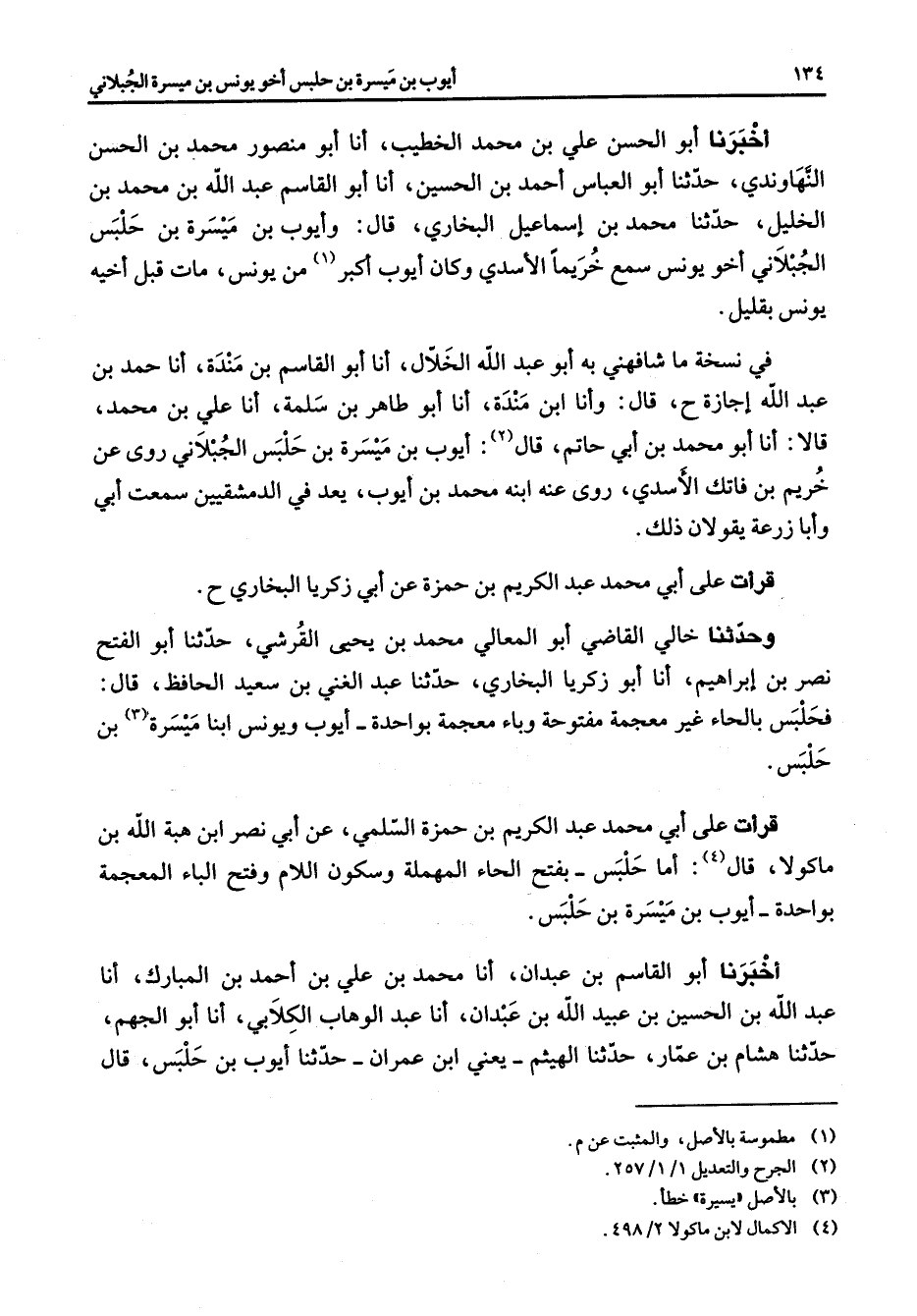 أخبرنا أبو الحسن علي بن محمد الخطيب أنا أبو منصور محمد بن الحسن النهاوندي حدثنا أبو العباس أحمد بن الحسين أنا أبو القاسم عبد الله بن محمد بن الخليل حدثنا محمد بن إسماعيل البخاري قال وأيوب بن ميسرة بن حلبس الجبلاني أخو يونس سمع خريما الأسدي وكان أيوب أكبر (1) من يونس مات قبل أخيه يونس بقليل في نسخة ما شافهني به أبو عبد الله الخلال أنا أبو القاسم بن مندة أنا حمد بن عبد الله إجازة قال وأنا ابن مندة أنا أبو طاهر بن سلمة أنا علي بن محمد قالا أنا أبو محمد بن أبي حاتم قال (2) أيوب بن ميسرة بن حلبس الجبلاني روى عن خريم بن فاتك الأسدي روى عنه ابنه محمد بن أيوب يعد في الدمشقيين سمعت أبي أبا زرعة يقولان ذلك قرأت على أبي محمد عبد الكريم بن حمزة عن أبي زكريا البخاري وحدثنا خالي القاضي أبو المعالي محمد بن يحيى القرشي حدثنا أبو الفتح نصر بن إبراهيم أنا أبو زكريا البخاري حدثنا عبد الغني بن سعيد الحافظ قال فحلبس بالحاء غير معجمة مفتوحة وباء معجمة بواحدة أيوب ويونس ابنا ميسرة (3) بن حلبس قرأت على أبي محمد عبد الكريم بن حمزة السلمي عن أبي نصر ابن هبة الله بن ماكولا قال (4) أما حلبس بفتح الحاء المهملة وسكون اللام وفتح الباء المعجمة بواحدة أيوب بن ميسرة بن حلبس أخبرنا أبو القاسم بن عبدان أنا محمد بن علي بن أحمد بن المبارك أنا عبد الله بن الحسين بن عبيد الله بن عبدان أنا عبد الوهاب الكلابي أنا أبو الجهم حدثنا هشام بن عمار حدثنا الهيثم يعني ابن عمران حدثنا أيوب بن حلبس قال