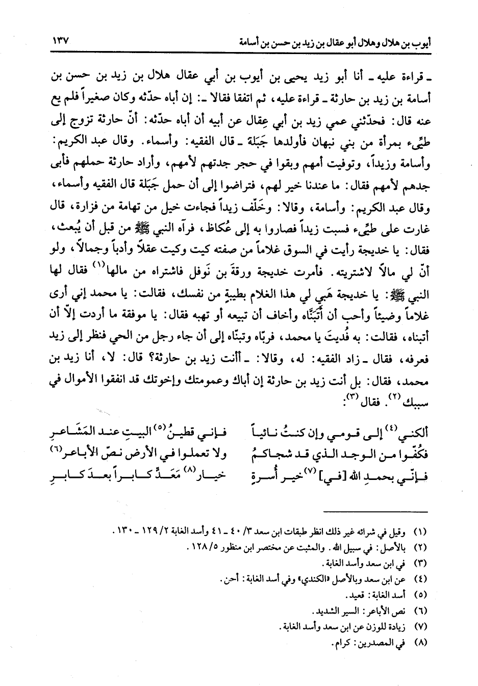 قراءة عليه أنا أبو زيد يحيى بن أيوب بن أبي عقال هلال بن زيد بن حسن بن أسامة بن زيد بن حارثة قراءة عليه ثم اتفقا فقالا إن أباه حدثه وكا صغيرا فلم يع عنه قال فحدثني عمي زيد بن أبي عقال عن أبيه أن أباه حدثه أن حارثة تزوج إلى طيئ بمرأة من بني نبهان فأولدها جبلة قال الفقيه وأسماء وقال عبد الكريم وأسامة وزيدا وتوفيت أمهم وبقوا في حجر جدتهم لأمهم وأراد حارثة حملهم فأبى جدهم لأمهم فقال ما عندنا خير لهم فتراضوا إلى أن حمل جبلة قال الفقيه وأسماء وقال عبد الكريم وأسامة وقالا وخلف زيدا فجاءت خيل من تهامة من فزارة قال غارت على طيئ فسبت زيدا فصاروا به إلى عكاظ فرآه النبي (صلى الله عليه وسلم) من قبل أن يبعث فقال يا خديجة رأيت في السوق غلاما من صفته كيت وكيت عقلا وأدبا وجمالا ولو أن لي مالا لاشتريته فأمرت خديجة ورقة بن نوفل فاشتراه من مالها (1) فقال لها النبي (صلى الله عليه وسلم) يا خديجة هبي لي هذا الغلام بطيبة من نفسك فقالت يا محمد إني أرى غلاما وضيئا وأحب أن أتبناه وأخاف أن تبيعه أو تهبه فقال يا موفقة ما أردت إلا أن أتبناه فقالت به فديت يا محمد فرباه وتبناه إلى أن جاء رجل من الحي فنظر إلى زيد فعرفه فقال زاد الفقيه له وقالا أأنت زيد بن حارثة قال لا أنا زيد بن محمد فقال بل أنت زيد بن حارثة إن أباك وعمومتك وإخوتك قد انفقوا الأموال في سببك (2)