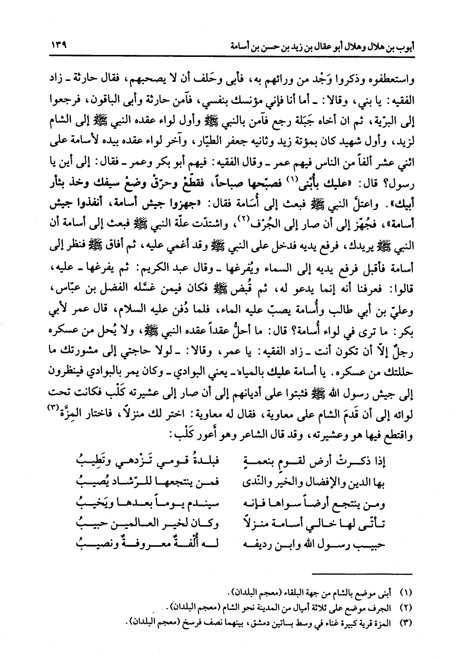 واستعطفوه وذكروا وجد من ورائهم به فأبى وحلف أن لا يصحبهم فقال حارثة زاد الفقيه يا بني وقالا أما أنا فإني مؤنسك بنفسي فآمن حارثة وأبى الباقون فرجعوا إلى البرية ثم أن أخاه جبلة رجع فآمن بالنبي (صلى الله عليه وسلم) وأول لواء عقده النبي (صلى الله عليه وسلم) إلى الشام لزيد وأول شهيد كان بمؤتة زيد وثانيه جعفر الطيار وآخر لواء عقده بيده لأسامة على اثني عشر ألفا من الناس فيهم عمر وقال الفقيه فيهم أبو بكر وعمر فقال إلى أين يا رسول قال عليك بأبنى (1) فصبحها صباحا فقطع وحرق وضع سيفك وخذ بثأر أبيك واعتل النبي (صلى الله عليه وسلم) فبعث إلى أسامة فقال جهزوا جهزوا جيش أسامة أنفذوا جيش أسامة فجهز إلى أن صار إلى الجرف (2) واشتدت علة النبي (صلى الله عليه وسلم) فبعث إلى أسامة أن النبي (صلى الله عليه وسلم) يريدك فرفع يديه فدخل على النبي (صلى الله عليه وسلم) وقد أغمي عليه ثم أفاق (صلى الله عليه وسلم) فنظر إلى أسامة فأقبل فرفع يديه إلى السماء ويفرغها وقال عبد الكريم ثم يفرغها عليه قالوا فعرفنا أنه إنما يدعو له ثم قبض (صلى الله عليه وسلم) فكان فيمن غسله الفضل بن عباس وعلي بن أبي طالب وأسامة يصب عليه الماء فلما دفن عليه السلام قال عمر لأبي بكر ما ترى في لواء أسامة قال ما أحل عقدا عقده النبي (صلى الله عليه وسلم) ولا يحل من عسكره رجل إلا أن تكون أنت زاد الفقيه يا عمر وقالا لولا حاجتي إلى مشورتك ما حللتك من عسكره يا أسامة عليك بالمياه يعني البوادي وكان يمر بالبوادي فينظرون إلى جيش رسول الله (صلى الله عليه وسلم) فثبتوا على أديانهم إلى أن صار إلى عشيرته كلب فكانت تحت لوائه إلى أن قدم الشام على معاوية فقال له معاوية اختر لكمنزلا فاختار المزة (3) واقتطع فيها هو وعشيرته وقد قال الشاعر وهو أعور كلب * إذا ذكرت أرض لقوم بنعمة * فبلدة قومي تزدهي وتطيب بها الدين والإفضال والخير والندى * فمن ينتجعها للرشاد يصيب ومن ينتجع أرضا سواها فإنه * سيندم يوما بعدها ويخيب تأتي لها خالي أسامة منزلا * وكان لخير العالمين حبيب حبيب رسول الله وابن رديفه * له ألفة معروفة ونصيب