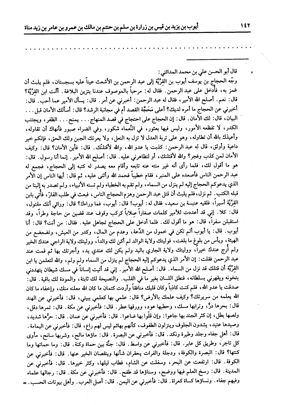 قال: يا أيوب ألم تكن في خمول من الدعة وعدم من المال وكدر من العيش وتضعضع من الهيئة ويأس من بلوغ ما بلغت فوليتك ولاية الوالد لم أكن يكن لك عندي يد وأجرتك بها ثم قمت عند عبد الرحمن فقلت: إن الامر الذي يدعوكم إليه الحجاج لم ينزل من السماء ولم ولم والله لتعلمن يا ابن القرية أن قتلك قد نزل من السماء