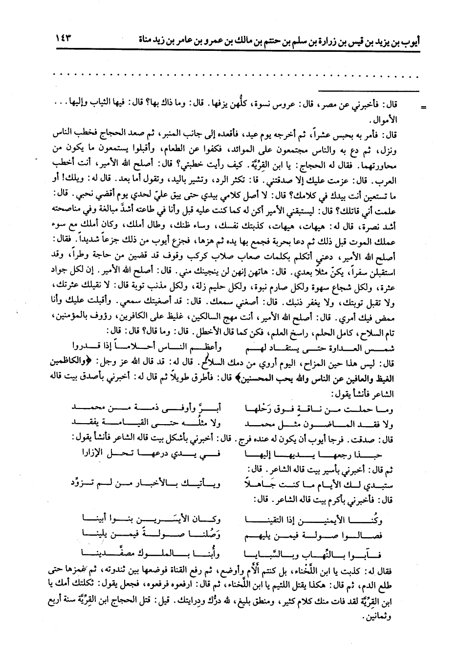قال: وكنا الايمنين إذا التقينا * وكان الايسرين بنوا أبينا فصالوا صولة فيمن يليهم * وصلنا صولة فيمن يلينا فآبوا بالنهاب وبالسبايا * وأبنا بالملوك مصفدينا فقاله: كذبت يا ابن اللخناء بل كنتم ألام وأوضع ثم رفع القناة فوضعها بين ثندوته ثم غمزها حتى طلع الدم ثم قال: هذكا يقتل الئيم يا ابن اللخناء ثم قال: ارفعوه فرفعوه فجعل يقول: ثكلتك أمك يا ابن القرية لقد فات منك كلام كثير ومنطق بليغ لله درك ودرايتك