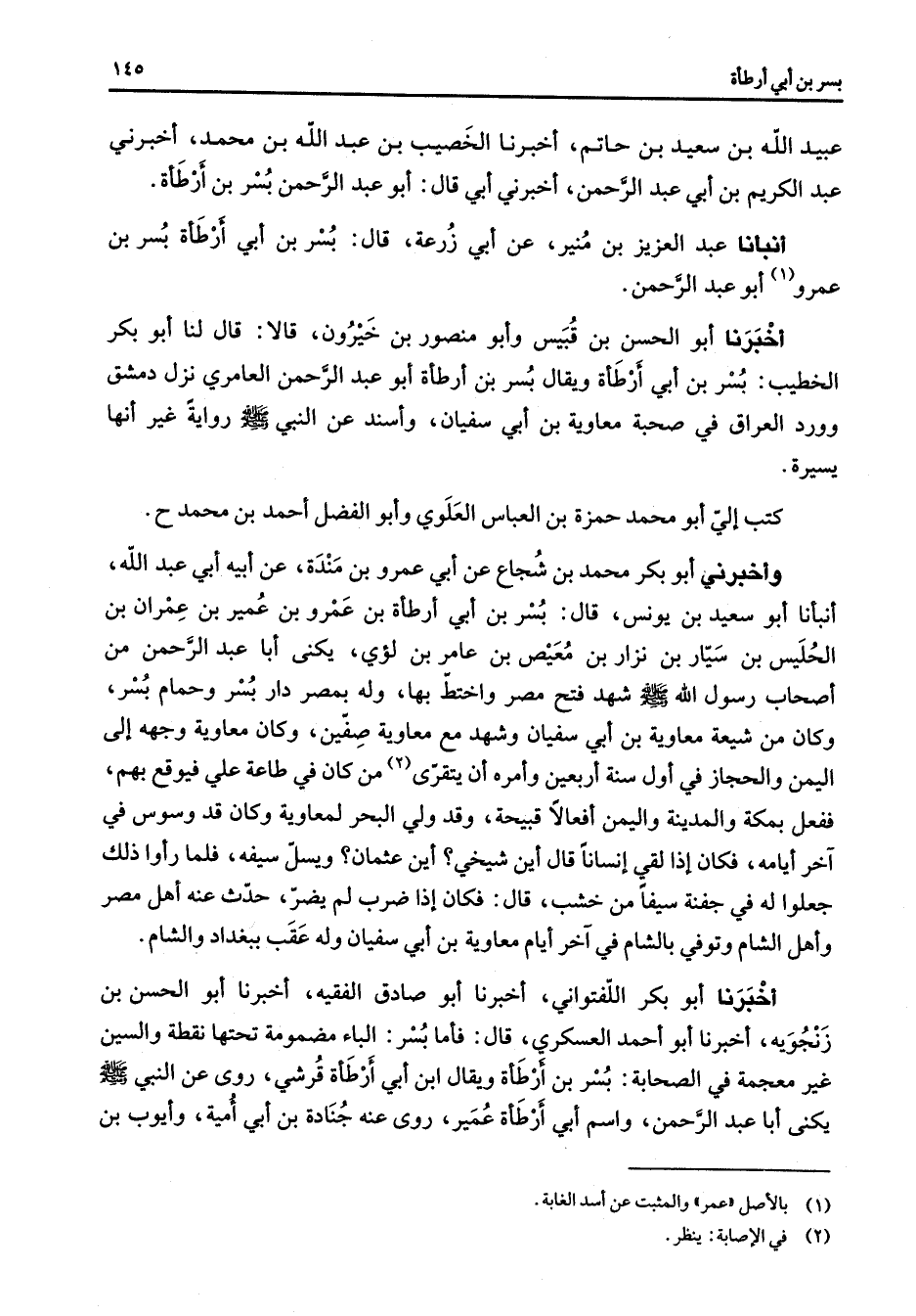 عبيد الله بن سعيد بن حاتم أخبرنا الخصيب بن عبد الله بن محمد أخبرني عبد الكريم بن أبي عبد الرحمن أخبرني أبي قال أبو عبد الرحمن بسر بن أرطأة أنبأنا عبد العزيز بن منير عن أبي زرعة قال بسر بن أبي أرطأة بسر بن عمرو (1) أبو عبد الرحمن أخبرنا أبو الحسن بن قبيس وأبو منصور بن خيرون قالا قال لنا أبو بكر الخطيب بسر بن أبي أرطأة ويقال بسر بن أرطأة أبو عبد الرحمن العامري نزل دمشق وورد العراق في صحبة معاوية بن أبي سفيان وأسند عن النبي (صلى الله عليه وسلم) رواية غير أنها يسيرة كتب إلي أبو محمد حمزة بن العباس العلوي وأبو الفضل أحمد بن محمد وأخبرني أبو بكر محمد بن شجاع عن أبي أرطأة بن عمرو بن مندة عن أبيه أبي عبد الله أنبأنا أبو سعيد بن يونس قال بسر بن أبي عمرو بن عمير بن عمران بن الحليس بن سيار بن نزار بن معيص بن عامر بن لؤي يكنى أبا عبد الرحمن من أصحاب رسول الله (صلى الله عليه وسلم) شهد فتح مصر واختبها وله بمصر دار بسر وحمام بسر وكان من شيعة معاوية بن أبي سفيان وشهد مع معاوية صفين وكان معاوية وجهه إلى اليمن والحجاز في أول سنة أربعين وأمره أن يتقرى (2) من كان في طاعة علي فيوقع بهم ففعل بمكة والمدينة واليمن أفعالا قبيحة وقد ولي البحر لمعاوية وكان قد وسوس في آخر أيامه فكان إذا لقي إنسانا قال أين شيخي أين عثمان ويسل سيفه فلما رأوا ذلك جعلوا له في جفنة سيفا من خشب قال فكان إذا ضرب لم يضر حدث عنه أهل مصر وأهل الشام وتوفي بالشام في آخر أيام معاوية بن أبي سفيان وله عقب ببغداد والشام أخبرنا أبو بكر اللفتواني أخبرنا أبو صادق الفقيه أخبرنا أبو الحسن بن زنجويه أخبرنا أبو أحمد العسكري قال فأما بسر الباء مضمومة تحتها نقطة والسين غير معجمة في الصحابة بسر بن أرطأة ويقال ابن أبي أرطأة قرشي روى عن النبي (صلى الله عليه وسلم) يكنى أبا عبد الرحمن واسم أبي أرطأة عمير روى عنه جنادة بن أبي أمية وأيوب بن