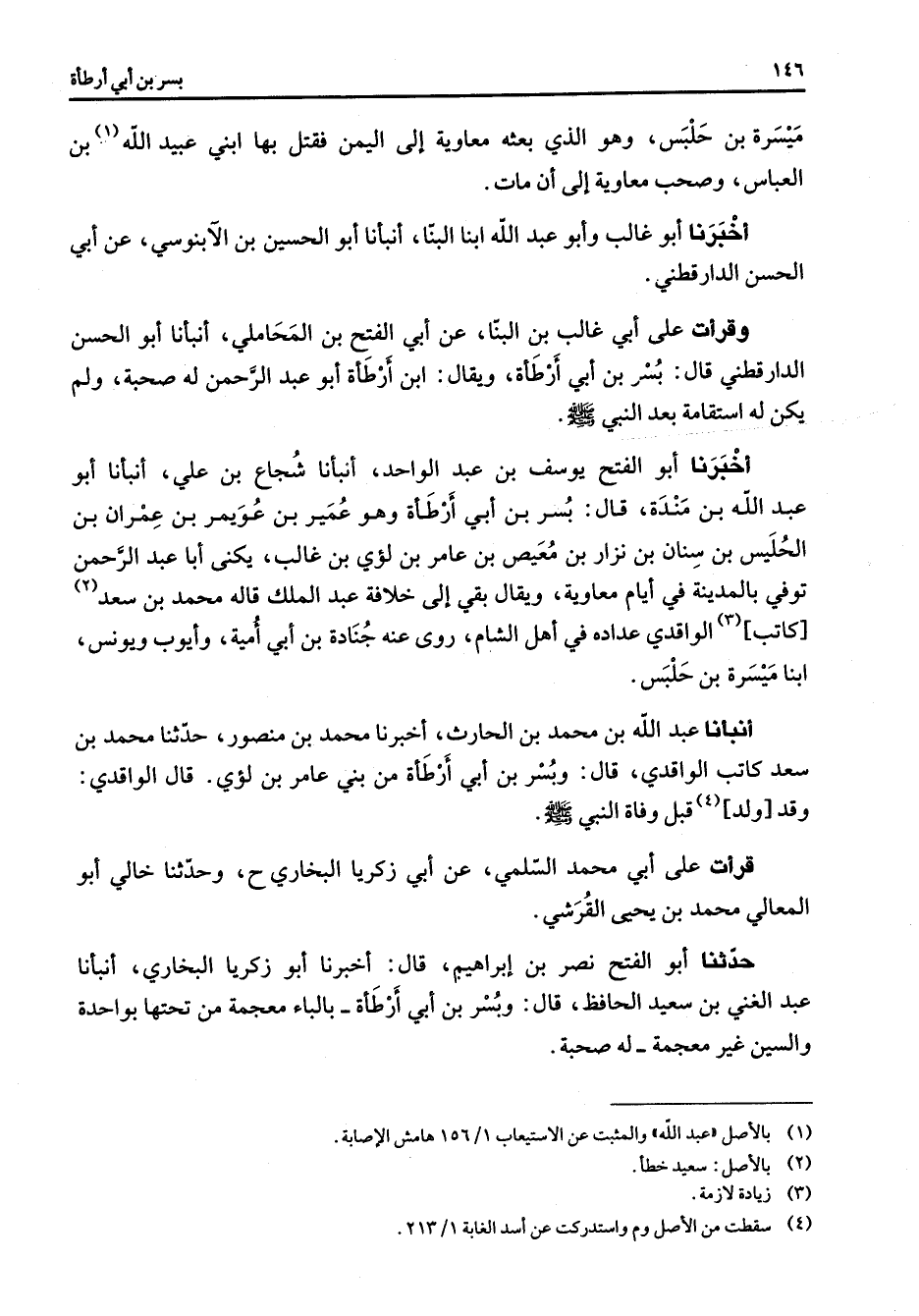ميسرة بن حلبس وهو الذي بعثه معاوية إلى اليمن فقتل بها ابني عبيد الله (1) بن العباس وصحب معاوية إلى أن مات أخبرنا أبو غالب وأبو عبد الله أبنا البنا أنبأنا أبو الحسين بن الآبنوسي عن أبي الحسن الدارقطني وقرأت على أبي غالب بن البنا عن أبي الفتح بن المحاملي أنبأنا أبو الحسن الدارقطني قال بسر بن أبي أرطأة ويقال ابن أرطأة أبو عبد الرحمن له صحبة ولم يكن له استقامة بعد النبي (صلى الله عليه وسلم) أخبرنا أبو الفتح يوسف بن عبد الواحد أنبأنا شجاع بن علي أنبأنا أبو عبد الله بن مندة قال بسر بن أبي أرطأة وهو عمير بن عويمر بن عمران بن الحليس بن سنان بن نزار بن معيص بن عامر بن لؤي بن غالب يكنى أبا عبد الرحمن توفي بالمدينة في أيام معاوية ويقال بقي إلى خلافة عبد الملك قاله محمد بن سعد (2) كاتب (3) الواقدي عداده في أهل الشام روى عنه جنادة بن أبي أمية وأيوب ويونس ابنا ميسرة بن حلبس أنبأنا عبد الله بن محمد بن الحارث أخبرنا محمد بن منصور حدثنا محمد بن سعد كاتب الواقدي قال وبسر بن أبي أرطأة من بني عامر بن لؤي قال الواقدي وقد ولد (4) قبل وفاة النبي (صلى الله عليه وسلم) قرأت على أبي محمد السلمي عن أبي زكريا البخاري وحدثنا خالي أبو المعالي محمد بن يحيى القرشي حدثنا أبو الفتح نصر بن إبراهيم قال أخبرنا أبو زكريا البخاري أنبأنا عبد الغني بن سعيد الحافظ قال وبسر بن أبي أرطأة بالباء معجمة من تحتها بواحدة والسين غير معجمة له صحبة