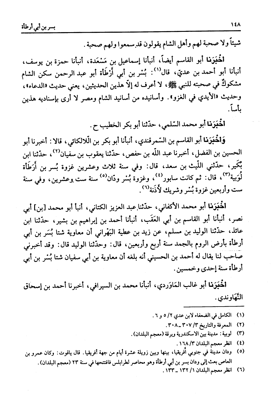 شيئا ولا صحبة لهم وأهل الشام يقولون قد سمعوا ولهم صحبة أخبرنا أبو القاسم أيضا أنبأنا إسماعيل بن مسعدة أنبأنا حمزة بن يوسف أنبأنا أبو أحمد بن عدي قال (1) بسر بن أبي أرطأة أبو عبد الرحمن سكن الشام مشكوك في صحبته للنبي (صلى الله عليه وسلم) ولا أعرف له إلا هذين الحديثين يعني حديث الدعاء وحديث الأيدي في الغزو وأسانيده من أسانيد الشام ومصر ولا أرى بإسناديه هذين بأسا أخبرنا أبو محمد السلمي حدثنا أبو بكر الخطيب وأخبرنا أبو القاسم بن السمرقندي أنبأنا أبو بكر بن اللالكائي قالا أخبرنا أبو الحسين بن الفضل أخبرنا عبد الله بن حفص حدثنا يعقوب بن سفيان (2) حدثنا ابن بكير حدثني الليث بن سعد قال وفي سنة ثلاث وعشرين غزوة بسر بن أرطأة لوبية (3) قال ثم كانت سابور (4) وغزوة بسر ودان (5) سنة ست وعشرين وفي سنة ست وأربعين غزوة بسر وشريك لأذنة (6) أخبرنا أبو محمد الأكفاني حدثنا عبد العزيز الكتاني أنبأ أبو محمد بن أبي نصر أنبأنا أبو القاسم بن أبي العقب أنبأنا أحمد بن إبراهيم بن بشير حدثنا ابن عائذ حدثنا الوليد بن مسلم عن زيد بن عطية البهراني أن معاوية شتا بسر بن أبي أرطأة بأرض الروم بالجمد سنة أربع وأربعين قال وحدثنا الوليد قال وقد أخبرني صاحب لنا يقال له أحمد بن الحسيني أنه بلغه أن معاوية بن أبي سفيان شتا بسر بن أبي أرطأة سنة إحدى وخمسين أخبرنا أبو غالب الماوردي أنبأنا محمد بن السيرافي أخبرنا أحمد بن إسحاق النهاوندي