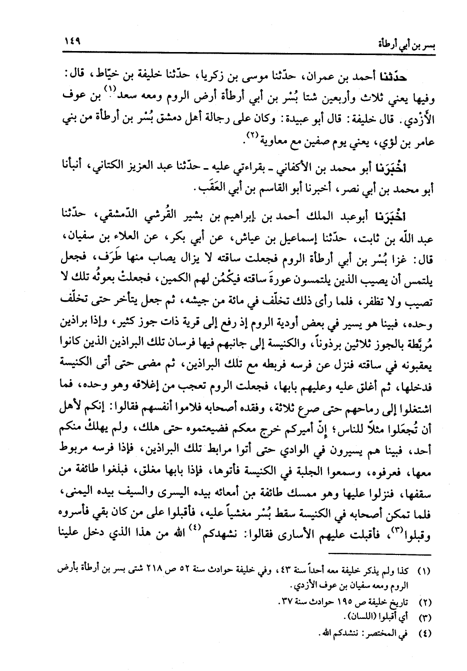 حدثنا أحمد بن عمران حدثنا موسى بن زكريا حدثنا خليفة بخياط قال وفيها يعني ثلاث وأربعين شتا بسر بن أبي أرطأة أرض الروم ومعه سعد (1) بن عوف الأزدي قال خليفة قال أبو عبيدة وكان على رجالة أهل دمشق بسر بن أرطأة من بني عامر بن لؤي يعني يوم صفين مع معاوية (2) أخبرنا أبو محمد بن الأكفاني بقراءته عليه حدثنا عبد العزيز الكتاني أنبأنا أبو محمد بن أبي نصر أخبرنا أبو القاسم بن أبي العقب أخبرنا أبو عبد الملك أحمد بن إبراهيم بن بشير القرشي الدمشقي حدثنا عبد الله بن ثابت حدثنا إسماعيل بن عياش عن أبي بكر عن العلاء بن سفيان قال غزا بسر بن أبي أرطأة الروم فجعلت ساقته لا يزال يصاب منها طرف فجعل يلتمس أن يصيب الذين يلتمسون عورة ساقته فيكمن لهم الكمين فجعلت بعوثه تلك لا تصيب ولا تطفر فلما رأى ذلك تخلف في مائة من جيشه ثم جعل يتأخر حتى تخلف وحده فبينا هو يسير في بعض أودية الروم إذ رفع إلى قرية ذات جوز كثير وإذا براذية مربطة بالجوز ثلاثين برذونا والكنيسة إلى جانبهم فيها فرسان تلك البراذين الذين كانوا يعقبونه في ساقته فنزل عن فرسه فربطه مع تلك البراذين ثم مضى حتى أتى الكنيسة فدخلها ثم أغلق عليه وعليهم بابها فجعلت الروم تعجب من إغلاقه وهو وحده فما اشتغلوا إلى رماحهم حتى صرع ثلاثة وفقده أصحابه فلاموا أنفسهم فقالوا إنكم لأهل أن تجعلوا مثلا للناس إن أميركم خرج معكم فضيعتموه حتى هلك ولم يهلك منكم أحد فبينا هم يسيرون في الوادي حتى أتوا مرابط تلك البراذين فإذا فرسه مربوط معها فعرفوه وسمعوا الجلبة في الكنيسة فأتوها فإذا بابها مغلق فبلغوا طائفة من سقفها فنزلوا عليها وهو ممسك طائفة من أمعائه بيده اليسرى والسيف بيده اليمنى فلما تمكن أصحابه في الكنيسة سقط بسر مغشيا عليه فأقبلوا على من كان بقي فأسروه وقبلوا (3) فأقبلت عليهم الأسارى فقالوا نشهدكم (4) الله من هذا الذي دخل علينا