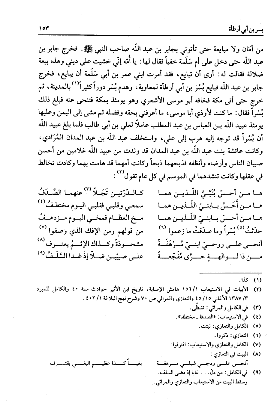 من أمان ولا مبايعة حتى تأتوني بجابر بن عبد الله صاحب النبي (صلى الله عليه وسلم) فخرج جابر بن عبد الله حتى دخل على أم سلمة خفيا فقال لها يا أمه إني خشيت على ديني وهذه بيعة ضلالة فقالت له أرى أن تبايع فقد أمرت ابني عمر بن أبي سلمة أن يبايع فخرج جابر بن عبد الله فبايبسر بن أبي أرطأة لمعاوية وهدم بسر دورا كثيرا (1) بالمدينة ثم خرج حتى أتى مكة فخافه أبو موسى الأشعري وهو يومئذ بمكة فتنحى عنه فبلغ ذلك بسرا فقال ما كنت لأوذي أبا موسى ما أعرفني بحقه وفضله ثم مشى إلى اليمن وعليها يومئذ عبيد الله بن العباس بن عبد المطلب عاملا لعلي بن أبي طالب فلما بلغ عبيد الله أن بسرا قد توجه إليه هرب إلى علي واستخلف عبد الله بن عبد المدان المرادي وكانت عائشة بنت عبد الله بن عبد المدان قد ولدت من عبيد الله غلامين من أحسن صبيان الناس وأرضاه وأنظفه فذبحهما ذبحا وكنت أمهما قد هامت بهما وكادت تخالط في عقلها وكانت تنشدهما في الموسم في كل عام تقول (2) * ها من أحس بنيي اللذين هما * كالدرتين تجلا (3) عنهما الصدف ها من أحس بابني اللذين هما * سمعي وقلبي فقلبي اليوم مختطف (4) ها من أحس بابني اللذين هما * مخ العظام فمخي اليوم مزدهف حدثت (5) بسرا وما صدقت ما زعموا (6) * من قولهم ومن الإفك الذي وصفوا (7) أنحى على روحي ابني مرهفة * مشحوذة وكذاك الإثم يعترف (8) من ذا لوالهة حرى مفجعة * على صبيين ضلا إذ غدا السلف (9)