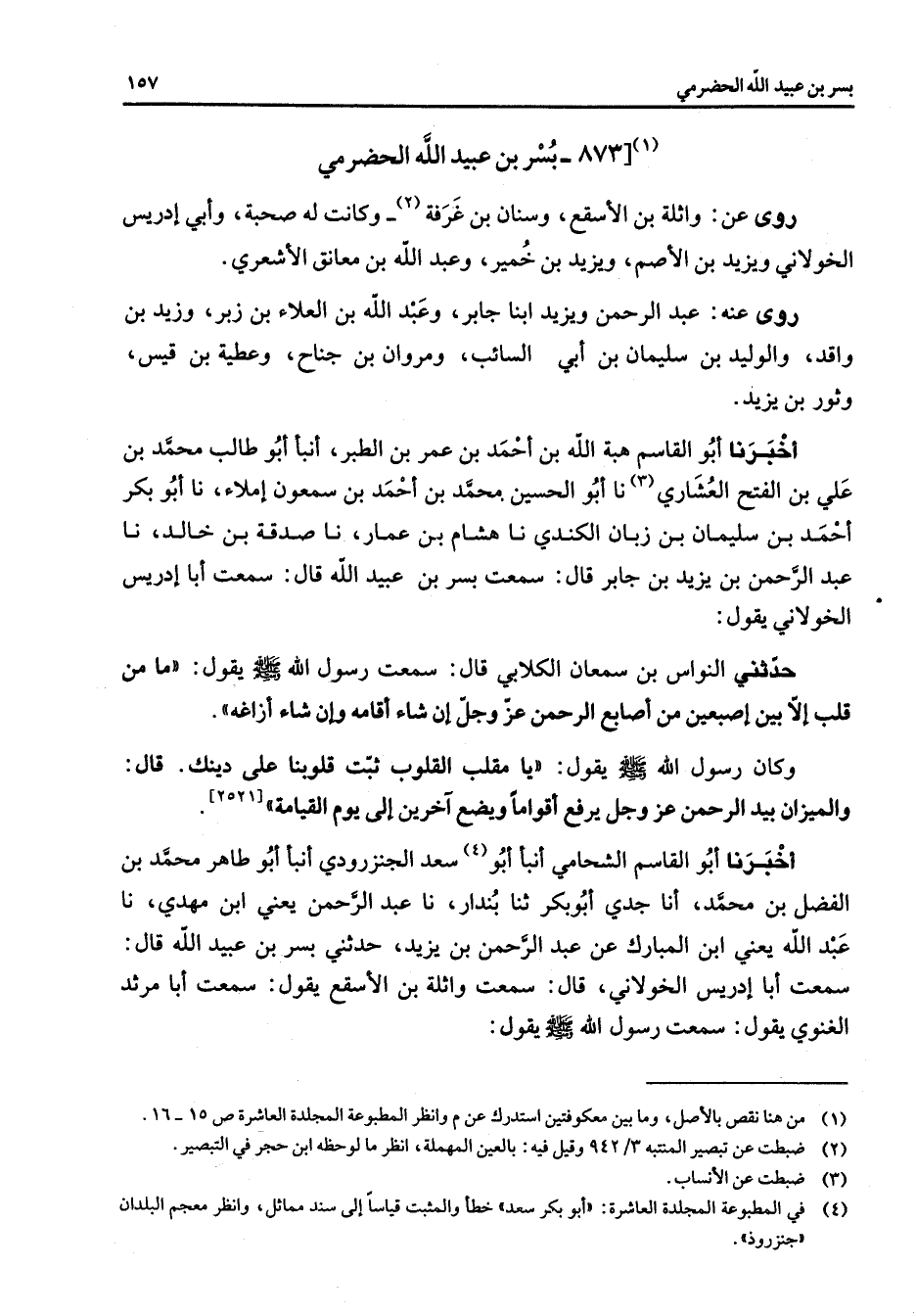 873 - بسر بن عبيد الله الحضرمي روى عن واثلة بن الأسقع وسنان بن غرفة (2) وكانت له صحبة وأبي إدريس الخولاني ويزيد بن الأصم ويزيد بن خمير وعبد الله بن معانق الأشعري روى عنه عبد الرحمن ويزيد ابنا جابر وعبد الله بن العلاء بن زبر وزيد بن واقد والوليد بن سليمان بن أبي السائب ومروان بن جناح وعطية بن قيس وثور بن يزيد أخبرنا أبو القاسم هبة الله بن أحمد بن عمر بن الطبر أنبأ أبو طالب محمد بن علي بن الفتح العشاري (3) نا أبو الحسين محمد بن أحمد بن سمعون إملاء نا أبو بكر أحمد بن سليمان بن زبان الكندي نا هشام بن عمار نا صدقة بن خالد نا عبد الرحمن بن يزيد بن جابر قال سمعت بسر بن عبيد الله قال سمعت أبا إدريس الخولاني يقول حدثني النواس بن سمعان الكلابي قال سمعت رسول الله (صلى الله عليه وسلم) يقول ما من قلب إلا بين إصبعين من أصابع الرحمن عز وجل إن شاء أقامه وإن شاء أزاغه وكان رسول الله (صلى الله عليه وسلم) يقول يا مقلب القلوب ثبت قلوبنا على دينك قال والميزان بيد الرحمن عز وجل يرفع أقواما ويضع آخرين إلى يوم القيامة أخبرنا أبو القاسم الشحامي أنبأ أبو (4) سعد الجنزرودي أنبأ أبو طاهر محمد بن الفضل بن محمد أنا جدي أبو بكر ثنا بندار نا عبد الرحمن يعني ابن مهدي نا عبد الله يعني ابن المبارك عن عبد الرحمن بن يزيد حدثني بسر بن عبيد الله قال سمعت أبا إدريس الخولاني قال سمعت واثلة بن الأسقع يقول سمعت أبا مرثد الغنوي يقول سمعت رسول الله (صلى الله عليه وسلم) يقول