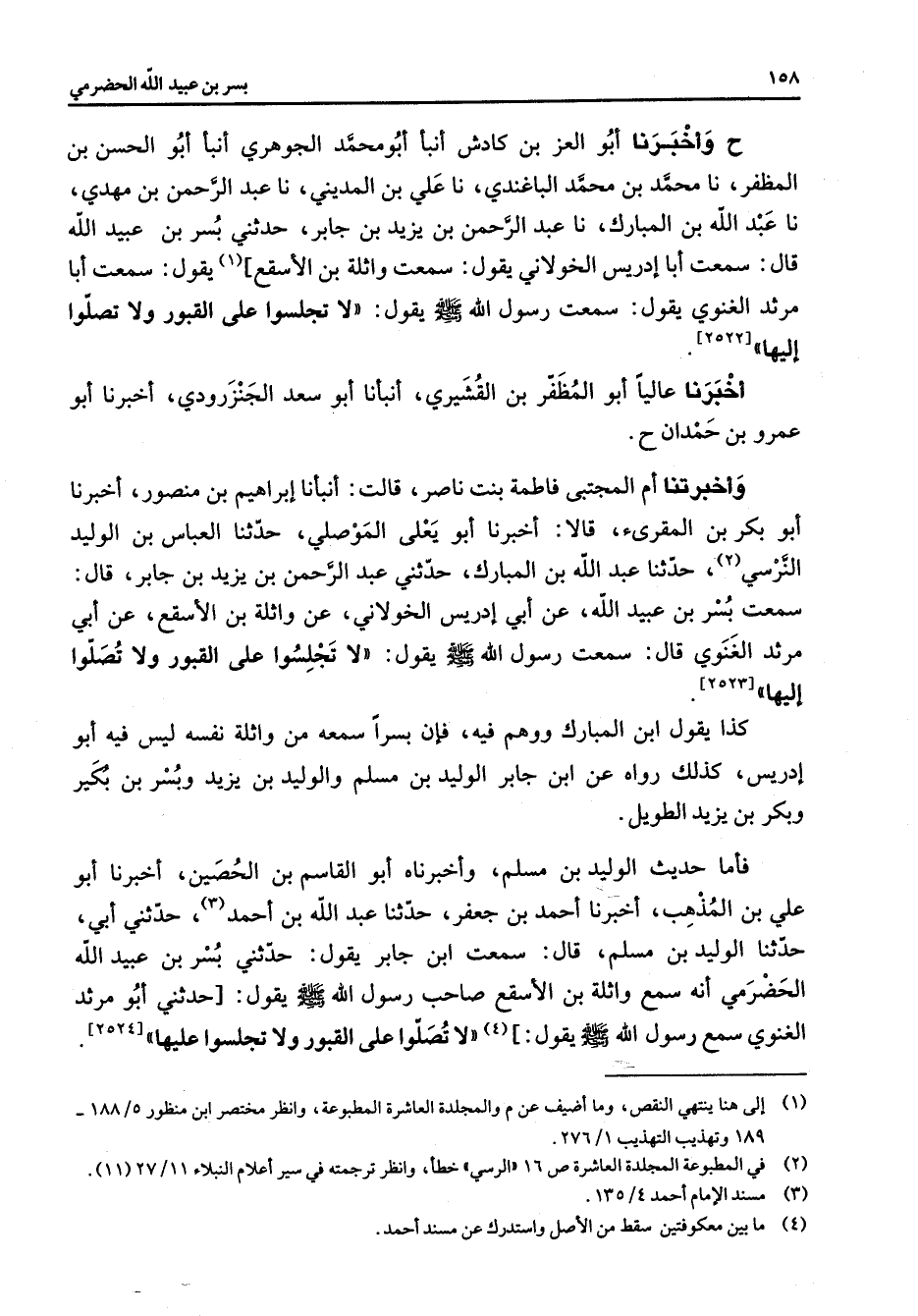 ح وأخبرنا أبو العز بن كادش أنبأ أبو محمد الجوهري أنبأ أبو الحسن بن المظفر نا محمد بن محمد الباغندي نا علي بن المديني نا عبد الرحمن بن مهدي نا عبد الله بن المبارك نا عبد الرحمن بن يزيد بن جابر حدثني بسر بن عبيد الله قال سمعت أبا إدريس الخولاني يقول سمعت واثلة بن الأسقع (1) يقول سمعت أبا مرثد الغنوي يقول سمعت رسول الله (صلى الله عليه وسلم) يقول لا تجلسوا على القبور ولا تصلوا إليها أخبرنا عاليا أبو المظفر بن القشيري أنبأنا أبو سعد الجنزرودي أخبرنا أبو عمرو بن حمدان وأخبرتنا أم المجتبى فاطمة بنت ناصر قالت أنبأنا إبراهيم بن منصور أخبرنا أبو بكر بن المقرئ قالا أخبرنا أبو يعلى الموصلي حدثنا العباس بن الوليد النرسي (2) حدثنا عبد الله بن المبارك حدثني عبد الرحمن بن يزيد بن جابر قال سمعت بسر بن عبيد الله عن أبي إدريس الخولاني عن واثلة بن الأسقع عن أبي مرثد الغنوي قال سمعت رسول الله (صلى الله عليه وسلم) يقول لا تجلسوا على القبور ولا تصلوا إليها كذا يقول ابن المبارك ووهم فيه فإن بسرا سمعه من واثلة نفسه ليس فيه أبو إدريس كذلك رواه عن ابن جابر الوليد بن مسلم والوليد بن يزيد وبسر بن بكير وبكر بن يزيد الطويل فأما حديث الوليد بن مسلم وأخبرناه أبو القاسم بن الحصين أخبرنا أبو علي بن المذهب أخبرنا أحمد بن جعفر حدثنا عبد الله بن أحمد (3) حدثني أبي حدثنا الوليد بن مسلم قال سمعت ابن جابر يقول حدثني بسر بن عبيد الله الحضرمي أنه سمع واثلة بن الأسقع صاحب رسول الله (صلى الله عليه وسلم) يقول حدثني أبو مرثد الغنوي سمع رسول الله (صلى الله عليه وسلم) يقول (4) " لا تصلوا على القبور ولا تجلسوا عليها