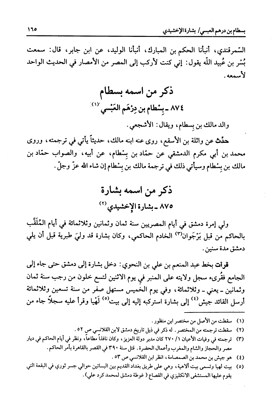 875 - بشارة الإخشيدي (2) ولي إمرأة دمشق في أيام المصريين سنة ثمان وثمانين وثلاثمائة في أيام الملقب بالحاكم من قبل برجوان (3) الخادم الحاكمي وكان بشارة قد ولي طبرية قبل أن يلي دمشق مدة سنين قرأت بخط عبد المنعم بن علي بن النحوي دخل بشارة إلى دمشق حتى جاء إلى الجامع فقرئ سجل ولايته على المنبر في يوم الاثنين لتسع خلون من رجب سنة ثمان وثمانين يعني وثلاثمائة وفي يوم الخميس مستهل صفر من ستة تسعين وثلاثمائة أرسل القائد جيش (4) إلى بشارة استركبه إليه إلى بيت (5) لهيا وقرأ عليه سجلا جاء من