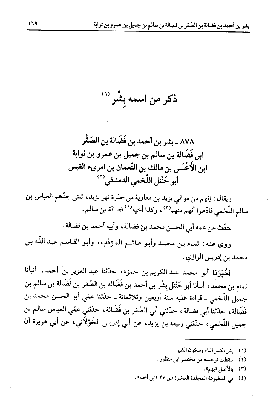 878 - بشر بن أحمد بن فضالة بن الصقر ابن فضالة بن سالم بن جميل بن عمرو بن ثوابة ابن الأخنس بن مالك بن النعمان بن امرئ القيس أبو حنتل اللخمي الدمشقي (2) ويقال إنهم من موالي يزيد بن معاوية بن حفرة نهر يزيد تبنى جدهم العباس بن سالم اللخمي فادعوا أنهم منهم (3) وكذا أخيه (4) فضالة بن سالم حدث عن عمه أبي الحسن محمد بن فضالة وأبيه أحمد بن فضالة روى عنه تمام بن محمد وأبو هاشم المؤدب وأبو القاسم عبد الله بن محمد بن إدريس الرازي أخبرنا أبو محمد عبد الكريم بن حمزة حدثنا عبد العزيز بن أحمد أنبأنا تمام بن محمد أنبأنا أبو حنتل بشر بن أحمد بن فضالة بن الصقر بن فضالة بن سالم بن جميل اللخمي قراءة عليه سنة أربعين وثلاثمائة حدثنا عمي أبو الحسن محمد بن فضالة حدثنا أبي فضالة حدثني أبي الصقر بن فضالة حدثني عمي العباس سالم بن جميل اللخمي حدثني ربيعة بن يزيد عن أبي إدريس الخولاني عن أبي هريرة أن