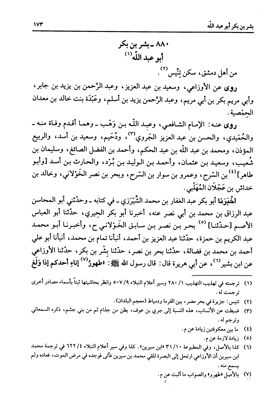 880 - بشر بن بكر أبو عبد الله (1) من أهل دمشق سكن تنيس (2) روى عن الأوزاعي وسعيد بن عبد العزيز وعبد الرحمن بن يزيد بن جابر وأبي مريم بكر بن أبي مريم وعبد الرحمن ويزيد بن أسلم وعبدة بنت خالد بن معدان الحمصية روى عنه الإمام الشافعي وعبد الله بن وهب وهما أقدم وفاة منه والحميدي والحسن بن عبد العزيز الجروي (3) ودحيم وسعيد بن أسد والربيع المؤذن ومحمد بن عبد الله بن عبد الحكم وأحمد بن الفضل الصائغ وسليمان بن شعيب وسعيد بن عثمان وأحمد بن الوليد بن برد والحارث بن أسد وأبو طاهر (4) بن السرح وعمرو بن سوار بن السرح وبحر بن نصر الخولاني وخالد بن خداش بن عجلان المهلبي أخبرنا أبو بكر عبد الغفار بن محمد الشيرزي في كتابه وحدثني أبو المحاسن عبد الرزاق بن محمد بن أبي نصر عنه أخبرنا أبو بكر الحيري حدثنا أبو العباس الأصم حدثنا (5) بحر بن نصر بن سابق الخلاني وأخبرنا أبو محمد عبد الكريم بن حمزة حدثنا عبد العزيز بن أحمد أنبأنا تمام بن محمد أنبأنا أبو علي أحمد بن محمد بن فضالة حدثنا بحر بن نصر حدثنا بشر بن بكر حدثنا الأوزاعي عن ابن بشير (6) عن أبي هريرة قال قال رسول الله (صلى الله عليه وسلم) طهور (7) إناء أحدكم إذا ولغ