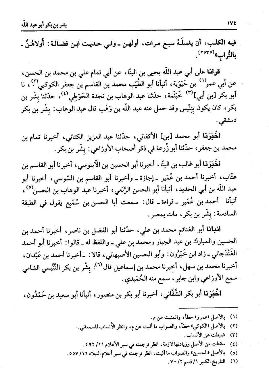 فيه الكلب أن يغسله سبع مرات أولهن وفي حديث ابن فضالة أولاهن بالتراب قرأنا على أبي عبد الله يحيى بن البنا عن أبي تمام علي بن محمد بن الحسن عن أبي عمر (1) بن حيوية أنبأنا أبو الطيب محمد بن القاسم بن جعفر الكوكبي (2) نا أبو بكر بن أبي (3) خيثمة حدثنا عبد الوهاب بن نجدة الحوطي (4) حدثنا بشر بن بكر كان يكون بتنيس وقد حمل عنه عبد الله بن وهب قال عبد الوهاب بشر بن بكر دمشقي أخبرنا أبو محمد بن الأكفاني حدثنا عبد العزيز الكتاني أخبرنا تمام بن محمد بن جعفر حدثنا أبو زرعة في ذكر أصحاب الأوزاعي بشر بن بكر أخبرنا أبو غالب بن البنا أخبرنا أبو الحسين بن الآبنوسي أخبرنا أبو القاسم بن عتاب أخبرنا أحمد بن عمير إجازة وأخبرنا أبو القاسم بن السوسي أخبرنا أبو عبد الله بن أبي الحديد أنبأنا أبو الحسن الربعي أخبرنا عبد الوهاب بن الحسن (5) أنبأنا أحمد بن عمير قراءة قال سمعت أبا الحسن بن سميع يقول في الطبقة السادسة بشر بن بكر ما ت بمصر أنبأنا أبو الغنائم محمد بن علي حدثنا أبو الفضل بن ناصر أخبرنا أحمد بن الحسين والمبارك بن عبد الجبار ومحمد بن علي واللفظ له قالوا أخبرنا أبو أحمد الغندجاني زاد ابن خيرون وأبو الحسين الأصبهاني قالا أخبرنا أحمد بن عبدان أخبرنا محمد بن سهل أخبرنا محمد بن إسماعيل قال (6) بشر بن بكر التنيسي الشامي سمع الأوزاعي وابن جابر سمع منه الحميدي أخبرنا أبو بكر الشقاني أخبرنا أبو بكر بن منصور أنبأنا أبو سعيد بن حمدون