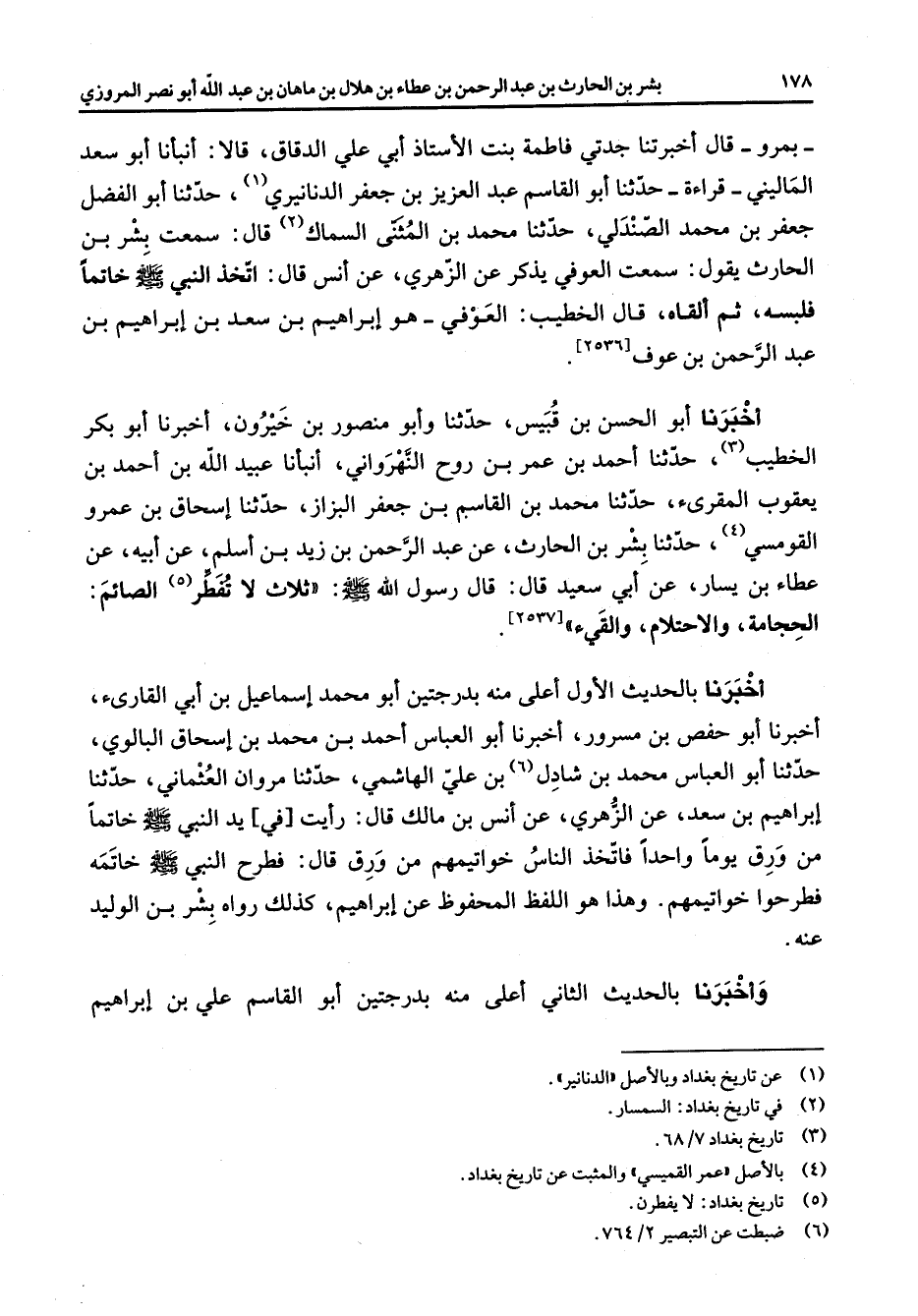 بمرو قال أخبرتنا جدتي فاطمة بنت الأستاذ أبو علي الدقاق قالا أنبأنا أبو سعد الماليني قراءة حدثنا أبو القاسم عبد العزيز بن جعفر الدنانيري (1) حدثنا أبو الفضل جعفر بن محمد الصندلي حدثنا محمد بن المثنى السماك (2) قال سمعت بشر بن الحارث يقول سمعت العوفي يذكر عن الزهري عن أنس قال اتخذ النبي (صلى الله عليه وسلم) خاتما فلبسه ثم ألقاه قال الخطيب العوفي هو إبراهيم بن سعد بن إبراهيم بن عبد الرحمن بن عوف أخبرنا أبو الحسن بن قبيس حدثنا وأبو منصور بن خيرون أخبرنا أبو بكر الخطيب (3) حدثنا أحمد بن عمر بن روح النهراوني أنبأنا عبيد الله بن أحمد بن يعقوب المقرئ حدثنا محمد بن القاسم بن جعفر البزاز حدثنا إسحاق بن عمرو القومسي (4) حدثنا بشر بن الحارث عن عبد الرحمن بن زيد بن أسلم عن أبيه عن عطاء بن يسار عن أبي سعيد قال قال رسول الله صلى الله عليه وسلم) ثلاث لا تفطر (5) الصائم الحجامة والاحتلام والقئ أخبرنا بالحديث الأول أعلى منه بدرجتين أبو محمد إسماعيل بن أبي القارئ أخبرنا أبو حفص بن مسرور أخبرنا أبو العباس أحمد بن محمد بن إسحاق البالوي حدثنا بو العباس محمد بن شادل (6) بن علي الهاشمي حدثنا مروان العثماني حدثنا إبراهيم بن سعد عن الزهري عن أنس بن مالك قال رأيت في يد النبي (صلى الله عليه وسلم) خاتما من ورق يوما واحدا فاتخذ الناس خواتيمهم من ورق قال فطرح النبي (صلى الله عليه وسلم) خاتمه فطرحوا خواتيمهم وهذا هو اللفظ المحفوظ عن إبراهيم كذلك رواه بشر بن الوليد عنه وأخبرنا بالحديث الثاني أعلى منه بدرجتين أبو القاسم علي بن إبراهيم