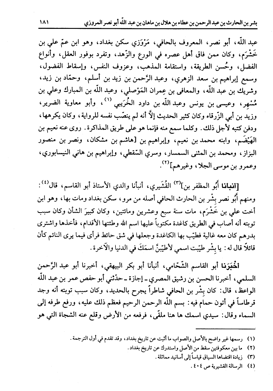 عبد الله أبو نصر المعروف بالحافي مروزي سكن بغداد وهو ابن عم علي بن خشرم وكان ممن فاق أهل عصره في الورع والزهد وتفرد بوفور العقل وأنواع الفضل وحسن الطريقة واستقامة المذهب وعزوف النفس وإسقاط الفضول وسمع إبراهيم بن سعد الزهري وعبد الرحمن بن زيد بن أسلم وحماد بن زيد وشريك بن عبد الله والمعافى بن عمران الموصلي وعبد الله بن المبارك وعلي بن مسهر وعيسى بن يونس وعبد الله بن داود الخريبي (1) وأبو معاوية الضرير وزيد بن أبي الزرقاء وكان كثير الحديث إلا أنه لم ينصب نفسه للرواية وكان يكرهها وفدن كتبه لأجل ذلك وكلما سمع منه فإنما هو على طريق المذاكرة روى عنه نعيم بن الهيضم وابنه محمد بن نعيم وإبراهيم بن هاشم بن مشكان ونصر بن منصور البزاز ومحمد بن المثنى السمسار وسري السقطي وإبراهيم بن هاني النيسابوري وعمرو بن موسى الجلا وغيرهم (2) أنبأنا أبو المظفر بن (3) القشيري أنبأنا والدي الأستاذ أبو القاسم قال (4) ومنهم أبو نصر بشر بن الحارث الحافي أصله من مرو سكن بغداد ومات بها وهو ابن أخت علي بن خشرم مات سنة سبع وعشرين ومائتين وكان كبير الشأن وكان سبب أخت علي بن خشرم مات سنة سبع وعشرين ومائتين وكان كبير الشأن وكان سبب توبته أنه أصاب في الطريق كاغدة مكتوبا عليها اسم الله وطئتها الأقدام فأخذها واشترى بدرهم كان معه غالية فطيب بها الكاغدة وجعلها في شق حائط فرأى فيما يرى النائم كأن قائلا قال له يا بشر طيبت اسمي لأطيبن اسمك في الدنيا والآخرة أخبرنا أبو القاسم الشحامي أنبأنا أبو بكر البيهقي أخبرنا أبو عبد الرحمن السلمي أخبرنا الحسن بن رشيق المصري إجازة حدثني أبو حفص عمر بن عبد الله الواعظ قال كان بشر بن الحافي شاطرا يجرح بالحديد وكان سبب توبته أنه وجد قرطاسا في أتون حمام فيه بسم الله الرحمن الرحيم فعظم ذلك عليه ورفع طرفه إلى السماء وقال سيدي اسمك ها هنا ملقى فرفعه من الأرض وقلع عنه الشجاة التي هو